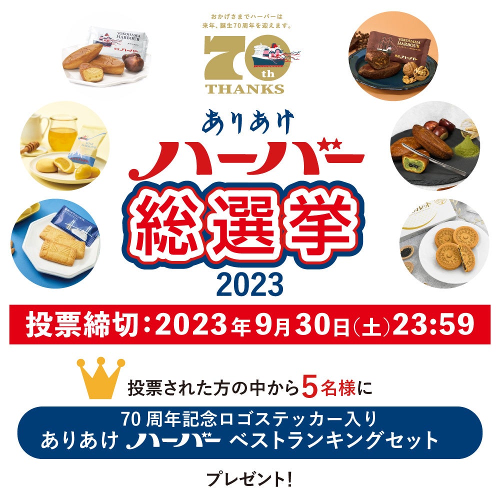 投票された方のなかから抽選で5名様に、70周年記念ロゴステッカー入りの「ありあけハーバー ベストランキングセット」をプレゼント。また人気上位商品のなかから2024年ハーバーの日に発売する70周年特別企画商品を選定いたします。(上位商品全てを商品化するものではございません。)