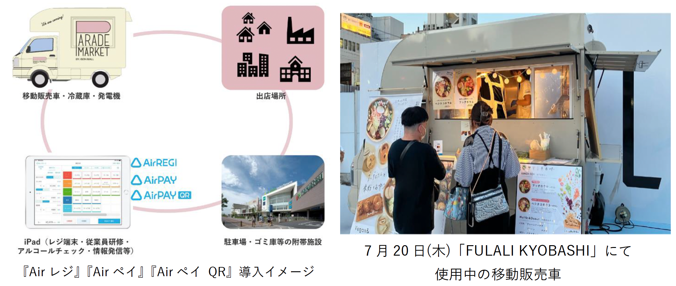 株式会社リクルート(本社:東京都千代田区、代表取締役社長:北村 吉弘、以下リクルート)は、イオンモール株式会社(本社:千葉県千葉市美浜区中瀬一丁目5番地1 7階・8階、代表取締役社長:岩村 康次、以下イオンモール)が2023年7月20日(木)にオープンした大阪府大阪市の「FULALI KYOBASHI」に、0円でカンタンに使えるPOSレジアプリ『Airレジ』と、カード・電子マネー・QR・ポイントも使えるお店の決済サービス『Airペイ』、オプションサービスの『Airペイ QR』を導入致します。移動販売車と出店場所を貸し出すイオンモールの新規事業の一環としての取り組みで、まずは11店舗から始めます。今後も当社のプロダクトで会計・決済・売上分析の業務効率化を支援し、接客や調理に集中できる環境を整えます。