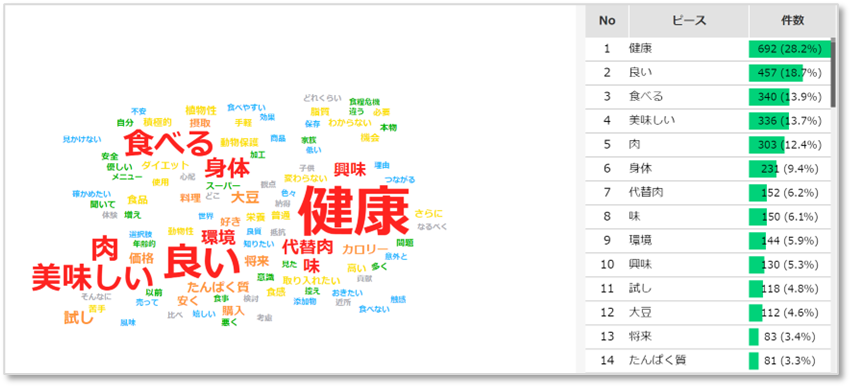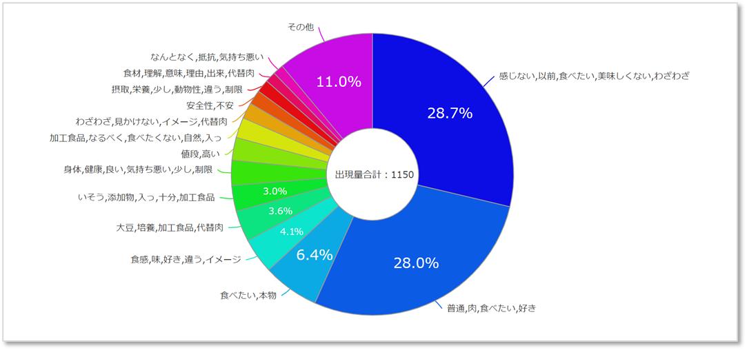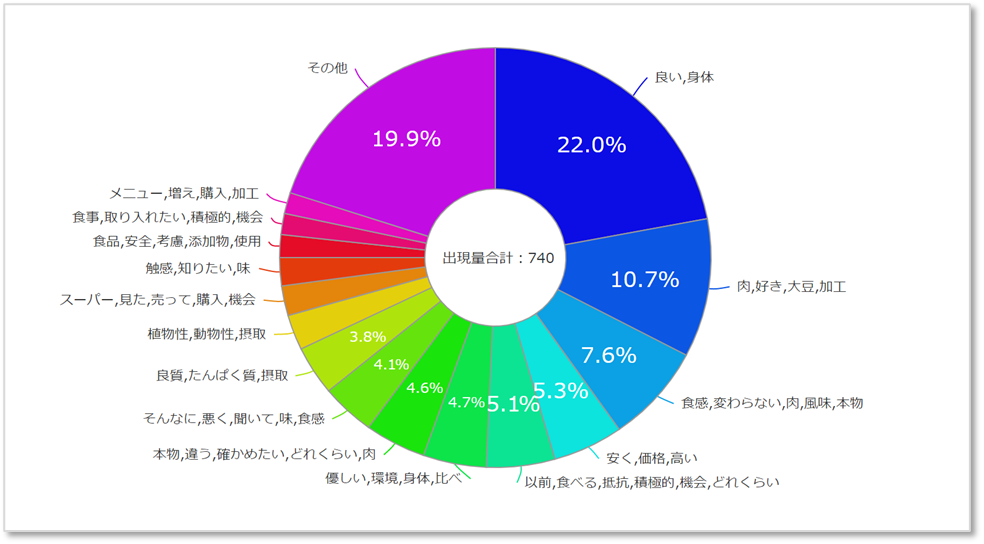 近年、スーパーなどでも代替肉製品を手軽に購入できるようになりました。健康意識の高まりや環境問題を背景に利用する人が増えているようです。そのため当社では「代替肉に関するアンケート調査(第2回)」を実施し、代替肉の喫食意向の理由4,781件の自由回答データを元に、弊社テキストマイニングツール「TextVoice」で分析したので、その結果をご紹介します。