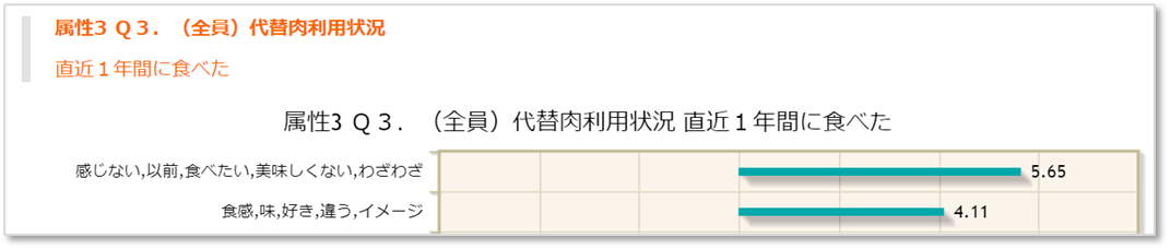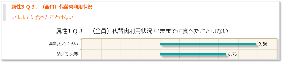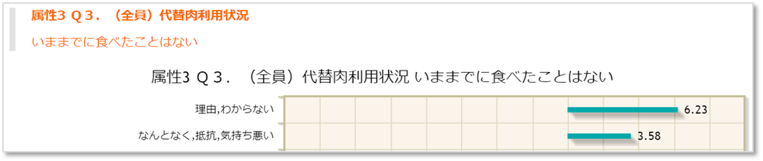 喫食未経験者は、代替肉に対して関心の低さやマイナスイメージをもっておりトライアルにつながっていないようです。未経験は6割以上のため、イメージ改善によりトライアル機会を増やす施策が必要そうです。