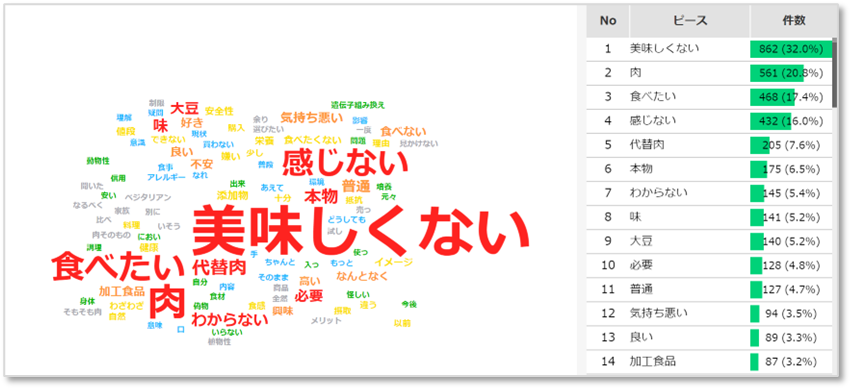 美味しくない、(肉を)食べたい、(肉を)感じないといったワードが上位にきています。
