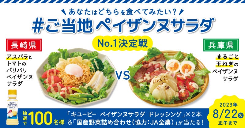 今回、キユーピー従業員がおすすめする8つのご当地ペイザンヌサラダの中からTwitter投票で食べたいNo.1を決める「ご当地ペイザンヌサラダNo.1決定戦」を開催します。7月に予選投票を行い、勝ち上がった長崎県「アスパラとトマトのパリパリペイザンヌサラダ」と兵庫県「まるごと玉ねぎのペイザンヌサラダ」で8月8日(火)から決選投票を行います。投票いただいた方の中から抽選で100名様に、全農セレクトの「国産野菜詰め合わせ」と「キユーピー ペイザンヌサラダ ドレッシング」をセットにしてプレゼントします。決選投票の結果は、8月30日(水)にキユーピーTwitter公式アカウントで発表します。