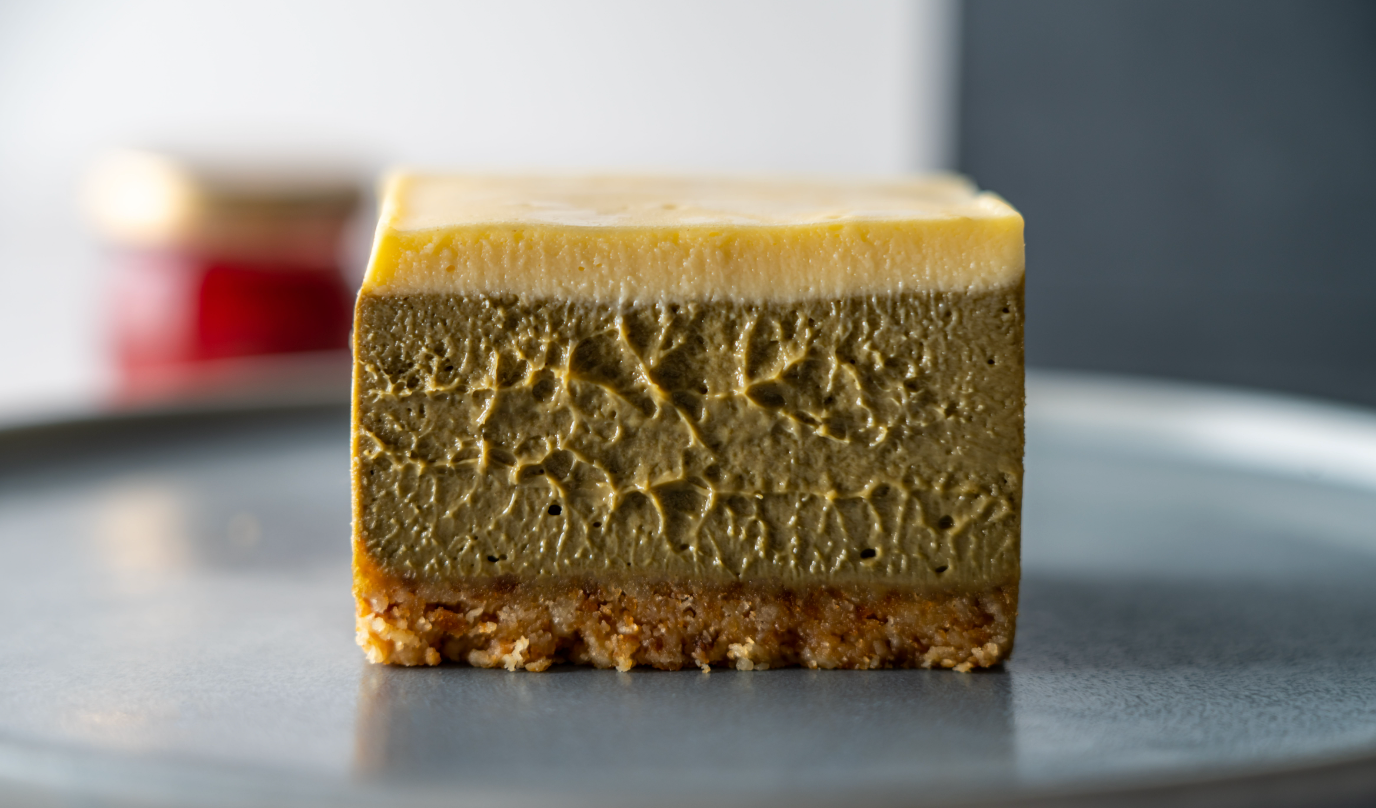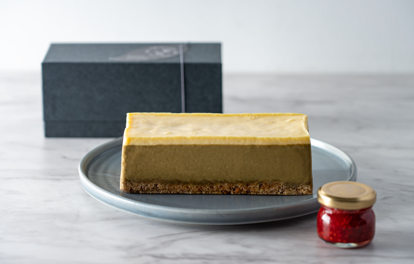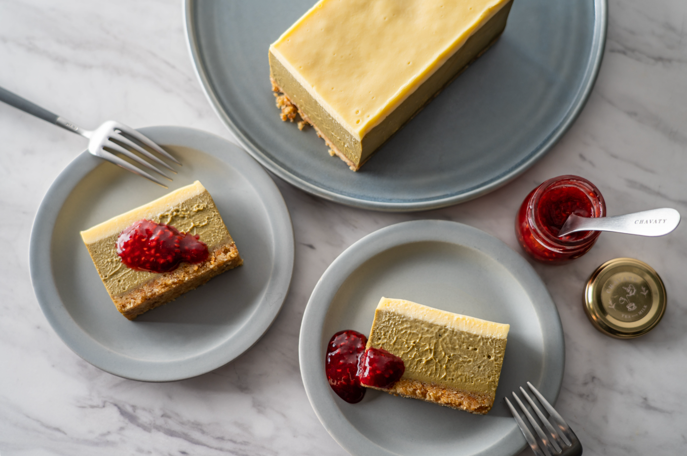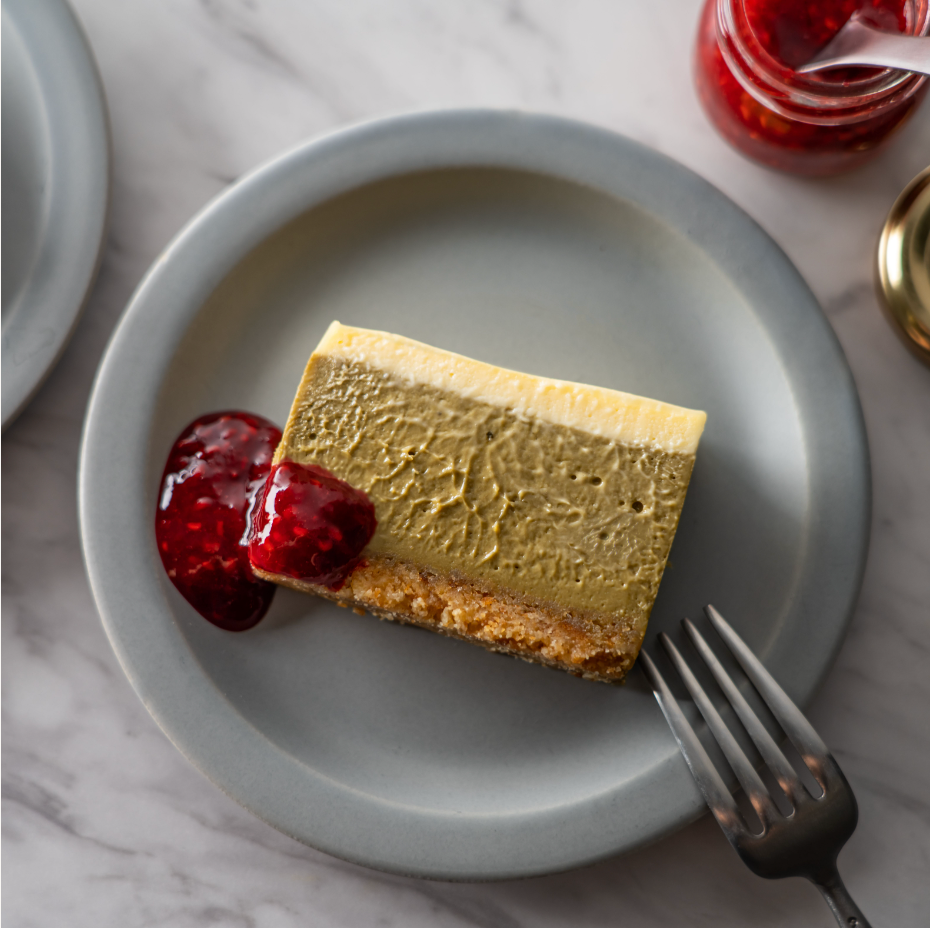 お茶本来の香りや味わいをミルクと合わせて楽しむことができる、CHAVATYで人気の上質な茶葉で作るティーラテ。中でも特に定評のある「ほうじ茶ティーラテ」の濃厚さと香り高い味わいを再現し、厳選された国産茶葉と伝統的な焙煎技術によって作られる「炭火ほうじ茶」を丸ごと粉砕して贅沢に使用しています。また、チーズの濃厚な味わいとほうじ茶の香りのバランスを追求し、なめらかな口当たりに仕上げました。「炭火ほうじ茶ティーラテチーズケーキ」は、ミルクチーズ、炭火ほうじ茶チーズ、スコーンクランブルの3層に仕立てており、味、香り、食感ともにバランスの取れた上品な味わいと、炭火ほうじ茶のコク深い焙煎香が特徴です。ラズベリーソースを添えて、 さらに華やかな味わいの変化もお楽しみいただけます。
