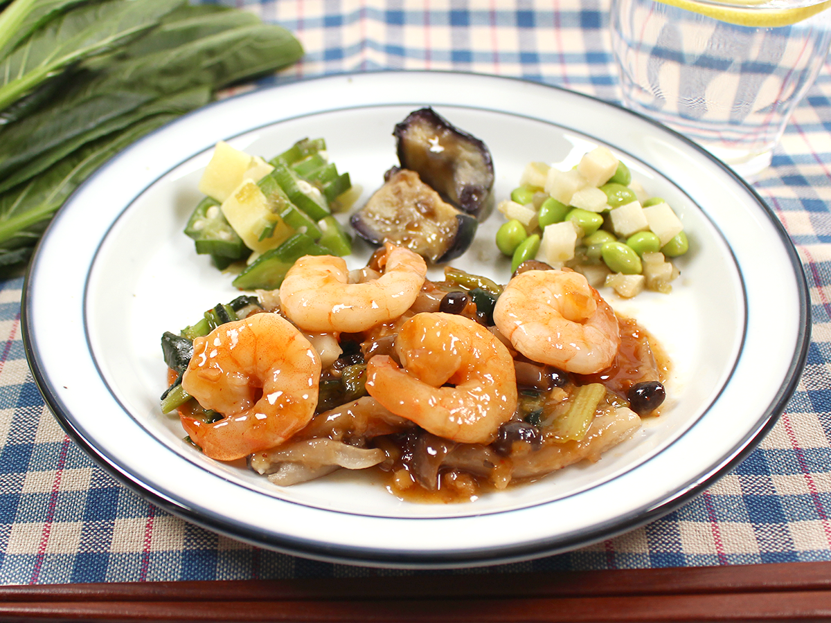 副菜は、じゃがいもの入ったオクラの高菜あえ、揚げ茄子の香味だれ、ゴマ油香る枝豆入りの筍ザーサイです。