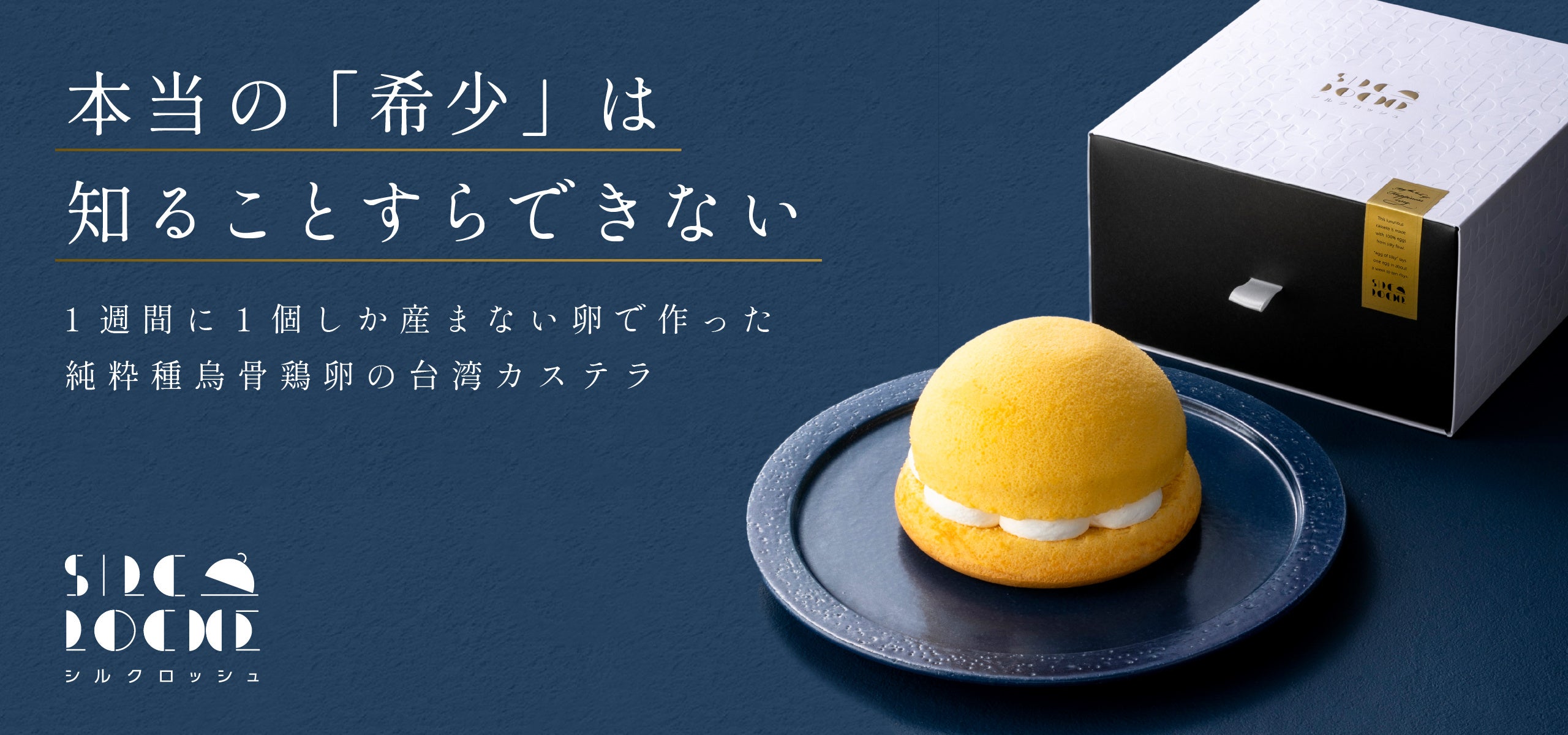 シンプルかつ洗練された素材をやさしく湯煎焼きした、純粋種烏骨鶏「プリンセスシルキー®」の卵本来の濃厚な味わいが感じられる台湾カステラです。シルクのような美しい光沢のあるメレンゲが生み出すふわふわな食感と生地に合うベストな配合の生クリームの組み合わせをお楽しみいただけます。※シルクロッシュ(台湾カステラ)1台につき、烏骨鶏卵を6個分も使用しています。
