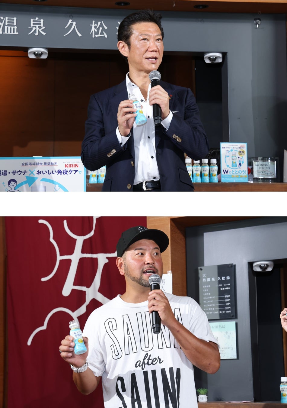 最後の「銭湯・サウナ×おいしい免疫ケアで”Wでととのう”」プロジェクトに関して、キリンビバレッジ株式会社 マーケティング部 ブランドマネージャー 山中進より本プロジェクト発足の経緯を説明。「免疫に関する意識は高まっていても、『免疫ケア』の行動をしている人は少ないというギャップがあることを背景に、心身ともに豊かに過ごす上で重要な『銭湯・サウナ』、その中でも昔から人々の健康を支えてきた全国浴場組合の皆様と一緒に、“Wでととのう”という新しい健康習慣を広げていきたい」とプロジェクトへの想いを語り、佐伯副理事長は「『銭湯・サウナ』を内側から健康になる施設として今後注目していただきたい。この取り組みが今後の入浴習慣として広まってもらいたい」と本プロジェクトへの期待や、リアルなお客様の声として「『おいしい免疫ケアを飲む機会をいただいて嬉しい』『毎日飲みやすい』などの声をいただいている」と紹介しました。また、サウナ師匠(秋山大輔さん)は「リセットされた後は体にいいものを取り入れたいと思うので、 “Wでととのう”はサウナーの間でも広がると思います」とコメントし、須田さんは「銭湯やサウナで汗を流してととのった後に、『おいしい免疫ケア』の染みわたるさわやかな甘さでおいしく『免疫ケア』して“Wでととのって”いただけると思います」とお話ししました。トークセッションの最後には、本プロジェクトで配布している「キリン おいしい免疫ケア」を3人で試飲。須田さんは「これを飲むのが楽しみなくらいスッキリした甘さがたまらないです」と試飲の感想を述べました。