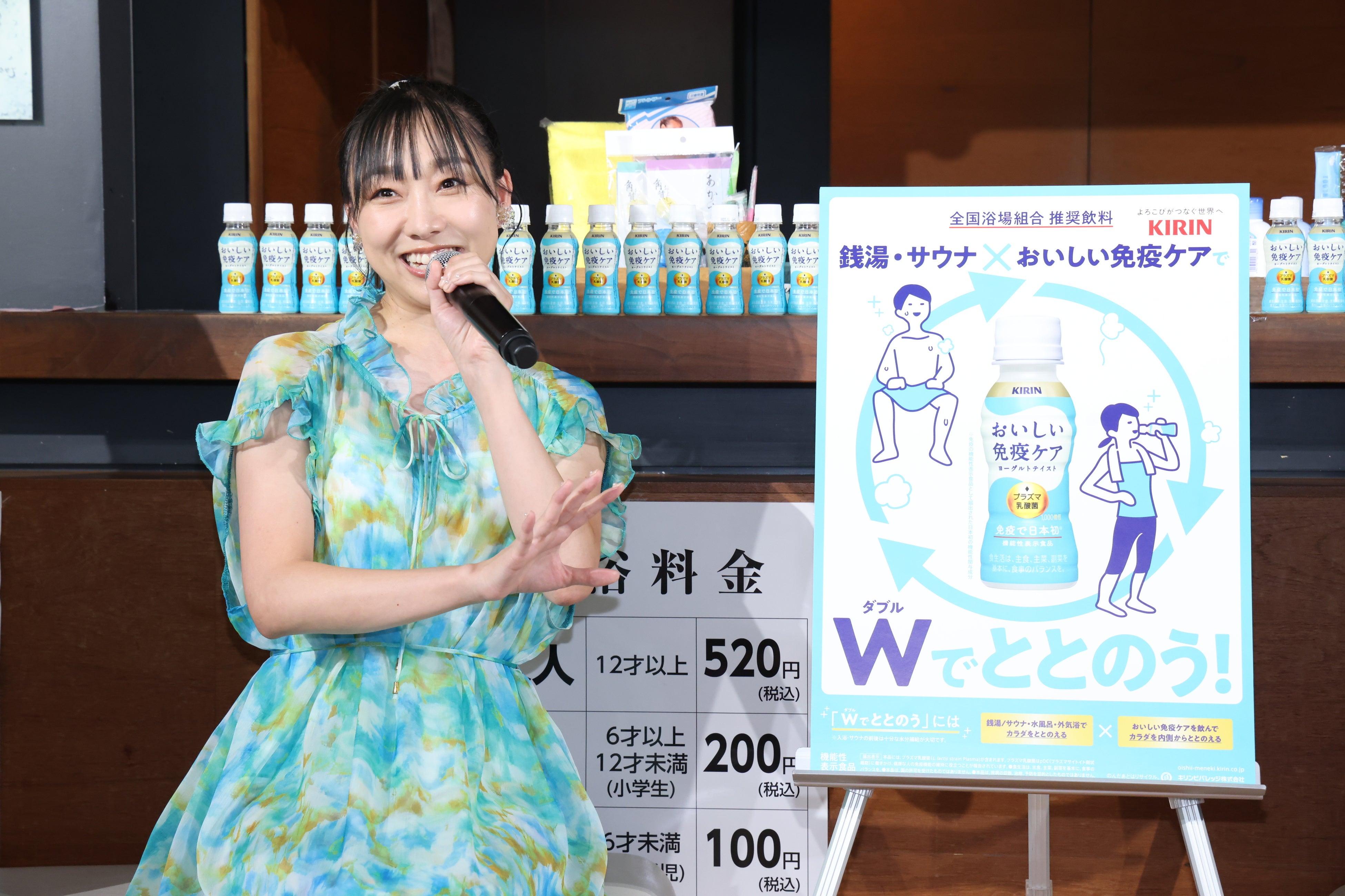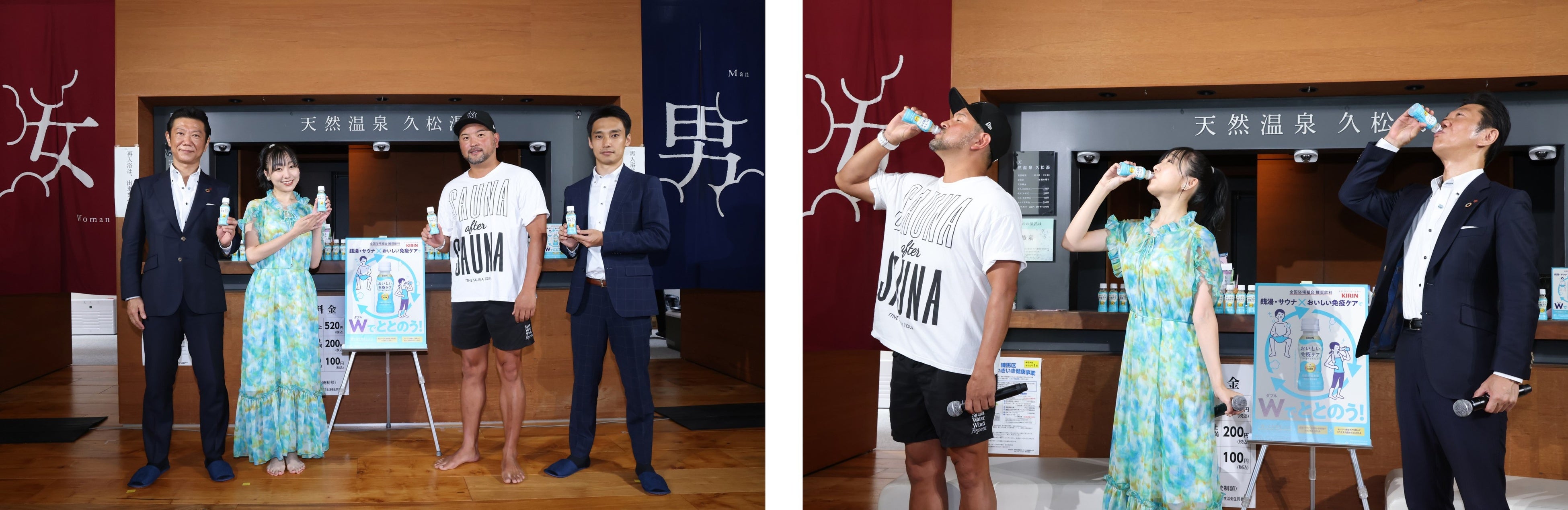 最後の「銭湯・サウナ×おいしい免疫ケアで”Wでととのう”」プロジェクトに関して、キリンビバレッジ株式会社 マーケティング部 ブランドマネージャー 山中進より本プロジェクト発足の経緯を説明。「免疫に関する意識は高まっていても、『免疫ケア』の行動をしている人は少ないというギャップがあることを背景に、心身ともに豊かに過ごす上で重要な『銭湯・サウナ』、その中でも昔から人々の健康を支えてきた全国浴場組合の皆様と一緒に、“Wでととのう”という新しい健康習慣を広げていきたい」とプロジェクトへの想いを語り、佐伯副理事長は「『銭湯・サウナ』を内側から健康になる施設として今後注目していただきたい。この取り組みが今後の入浴習慣として広まってもらいたい」と本プロジェクトへの期待や、リアルなお客様の声として「『おいしい免疫ケアを飲む機会をいただいて嬉しい』『毎日飲みやすい』などの声をいただいている」と紹介しました。また、サウナ師匠(秋山大輔さん)は「リセットされた後は体にいいものを取り入れたいと思うので、 “Wでととのう”はサウナーの間でも広がると思います」とコメントし、須田さんは「銭湯やサウナで汗を流してととのった後に、『おいしい免疫ケア』の染みわたるさわやかな甘さでおいしく『免疫ケア』して“Wでととのって”いただけると思います」とお話ししました。トークセッションの最後には、本プロジェクトで配布している「キリン おいしい免疫ケア」を3人で試飲。須田さんは「これを飲むのが楽しみなくらいスッキリした甘さがたまらないです」と試飲の感想を述べました。