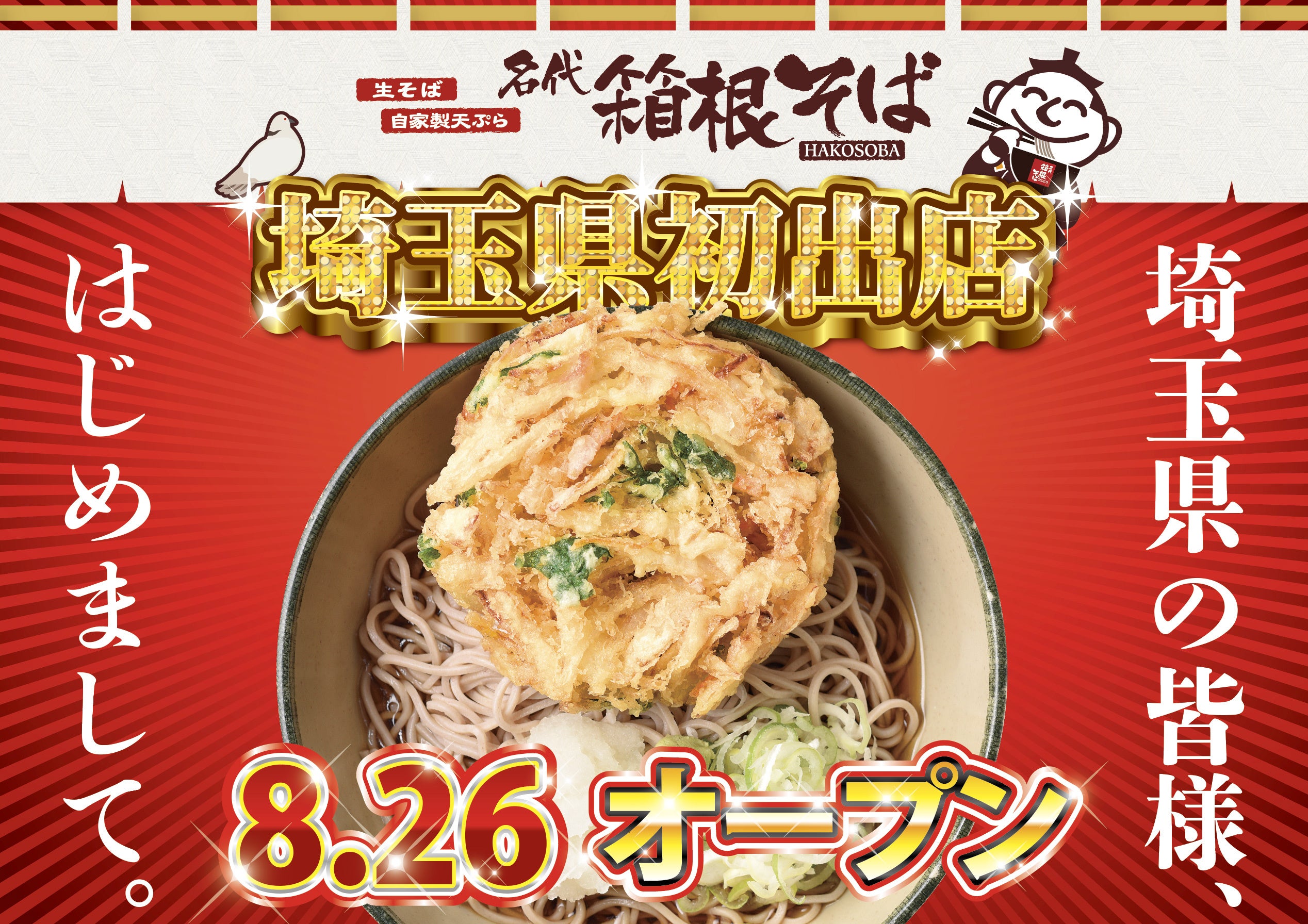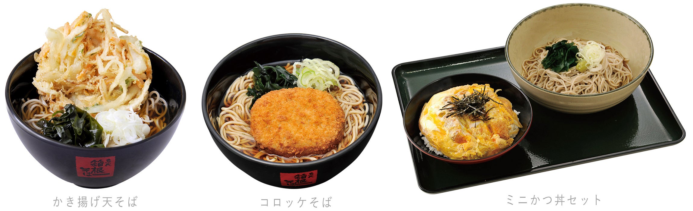 8月26日(土)~28日(月)の3日間、オープニングキャンペーンとして『特盛りそば』を販売いたします。売上No.1のかき揚げ天と、カレー味が特徴のコロッケという人気のツートップをトッピングし、麺を1.5玉に増量した「箱根そば」の名刺代わりともいえる逸品です。是非この機会にご賞味ください。