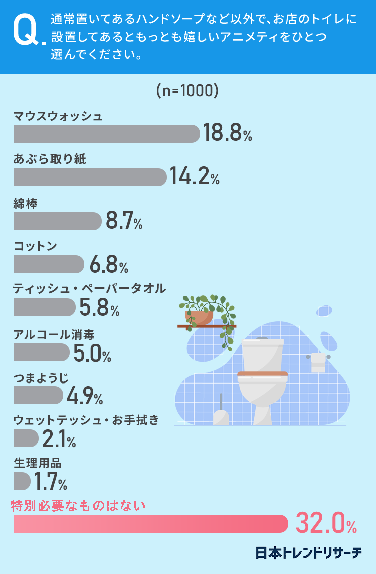 通常置いてあるハンドソープなど以外で、お店のトイレに設置してあるともっとも嬉しいアニメティをひとつ選んでもらいました。