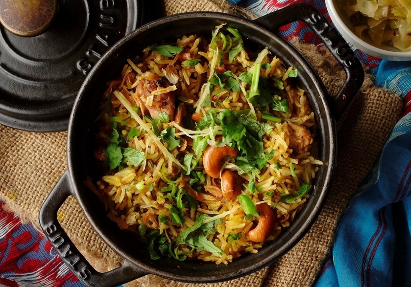 たっぷりのスパイスで作ったマサラとパラパラのバスマティ米を重ね合わせ、じっくりと炊き上げた風味豊かなチキンビリヤニです。