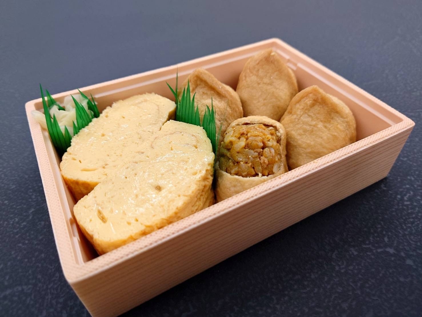 鶏そぼろ入りカレーのいなり寿司とふんわり柔らかな京だし巻のお弁当です。
