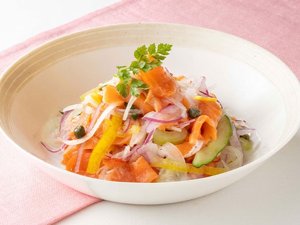 スモークサーモンにシャキシャキ野菜を合わせ、さっぱりとしたマリネにしました。