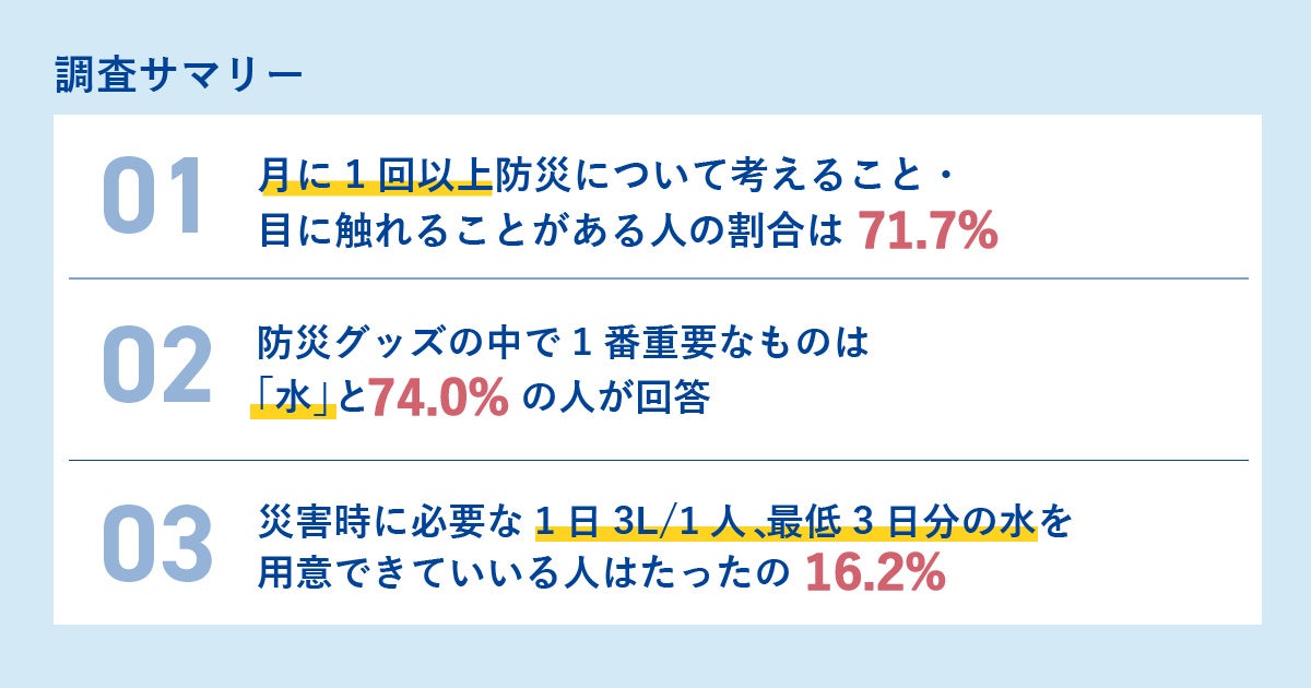 一方、災害時に必要な1日3L/1人 、最低3日分の水を用意できている人はたったの16.2%という結果に。