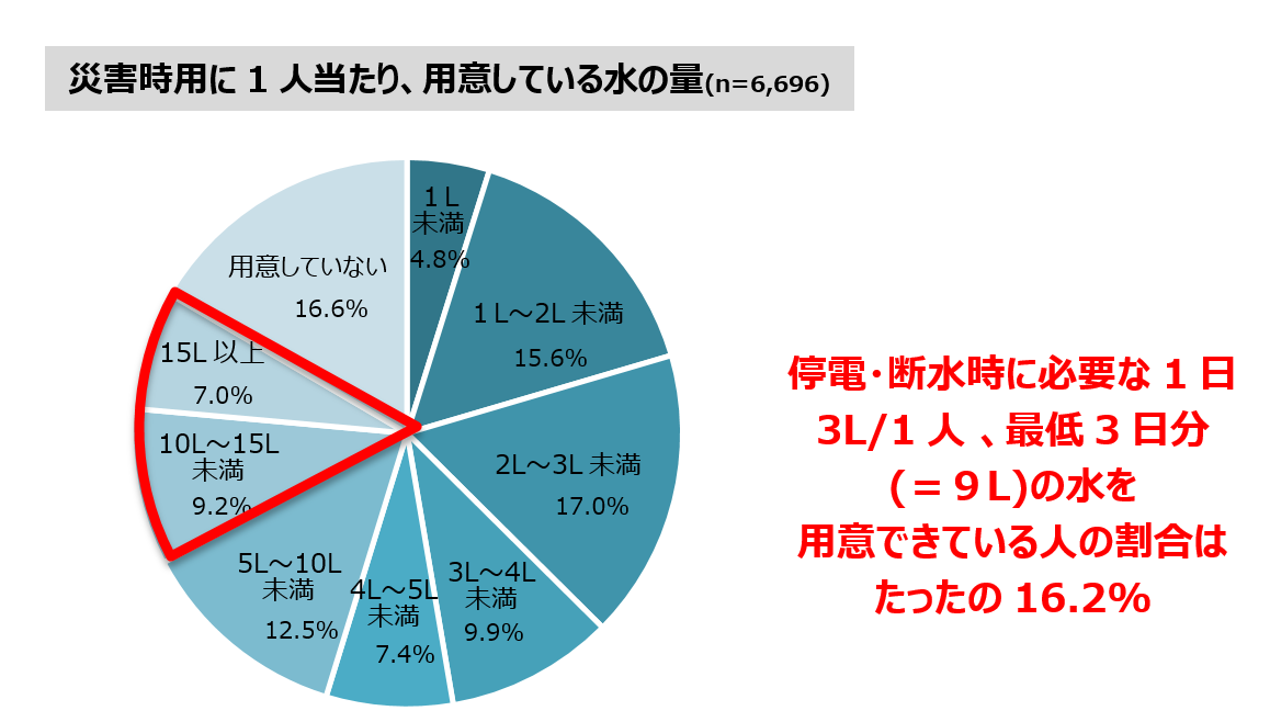 一方、災害時に必要な1日3L/1人 、最低3日分の水を用意できている人はたったの16.2%という結果に。