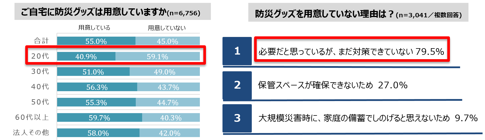 防災グッズを用意していない人の割合は45.0%で、特に20代は59.1%もの人が防災グッズを用意して