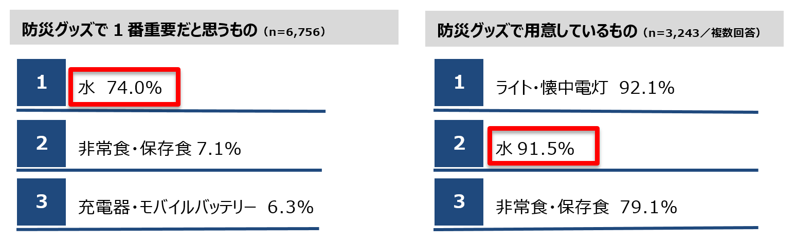 防災グッズの中で1番重要なものは「水」と74.0%の人が回答。