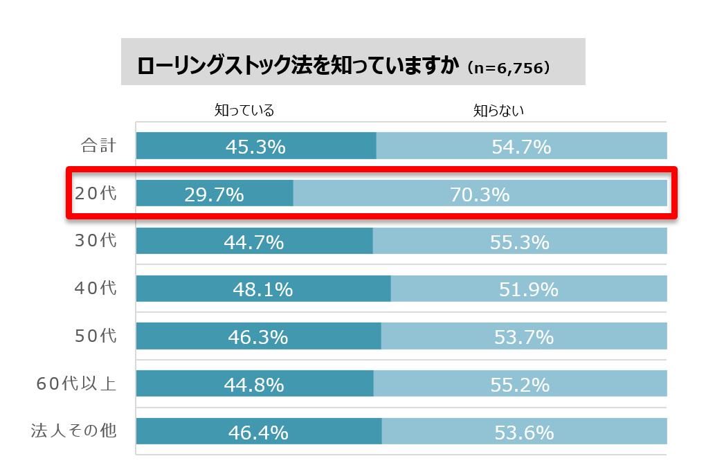 災害時に役立つ「ローリングストック法」を知らない人の割合は54.7%、特に20代は70.3%が知らないという結果に。