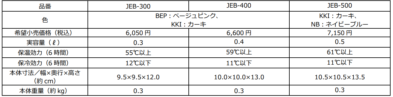 『サーモス 真空断熱スープジャー(JEB-300/400/500)』 仕様一覧