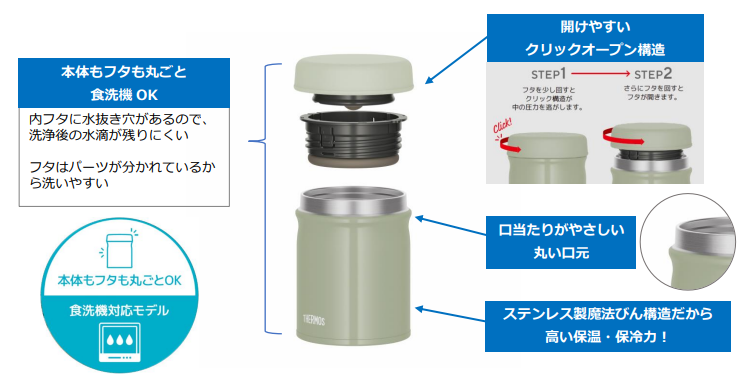 そして、このたびスープジャーでも全パーツ食洗機対応製品を開発。サーモス初の本体もフタも丸ごと食洗機対応の『サーモス 真空断熱スープジャー(JEB-300/400/500)』を新発売します。