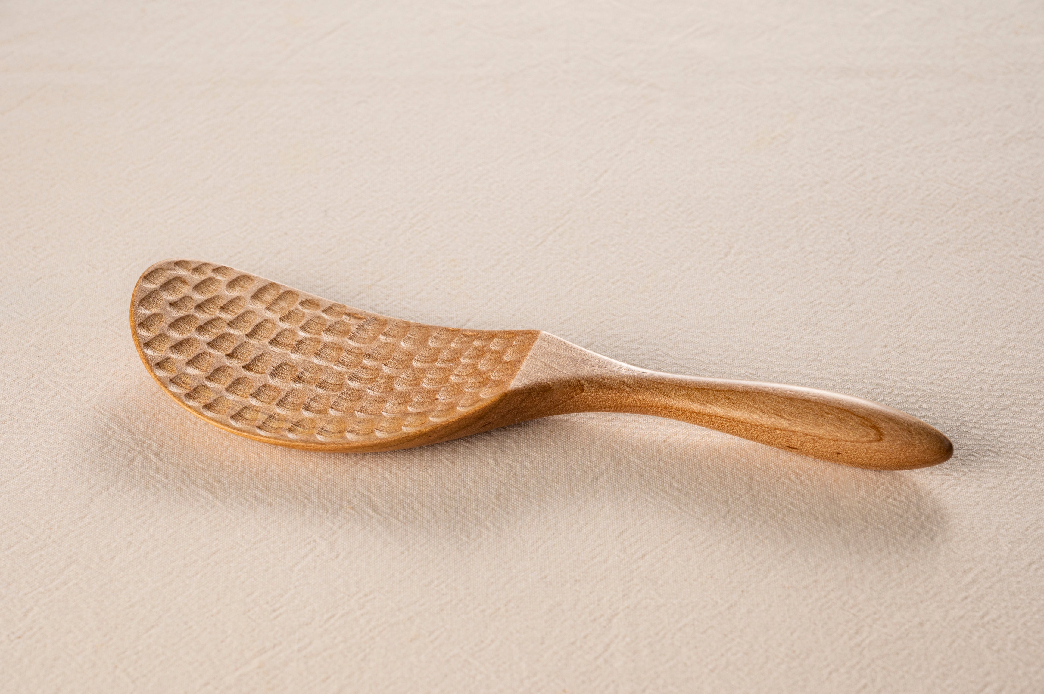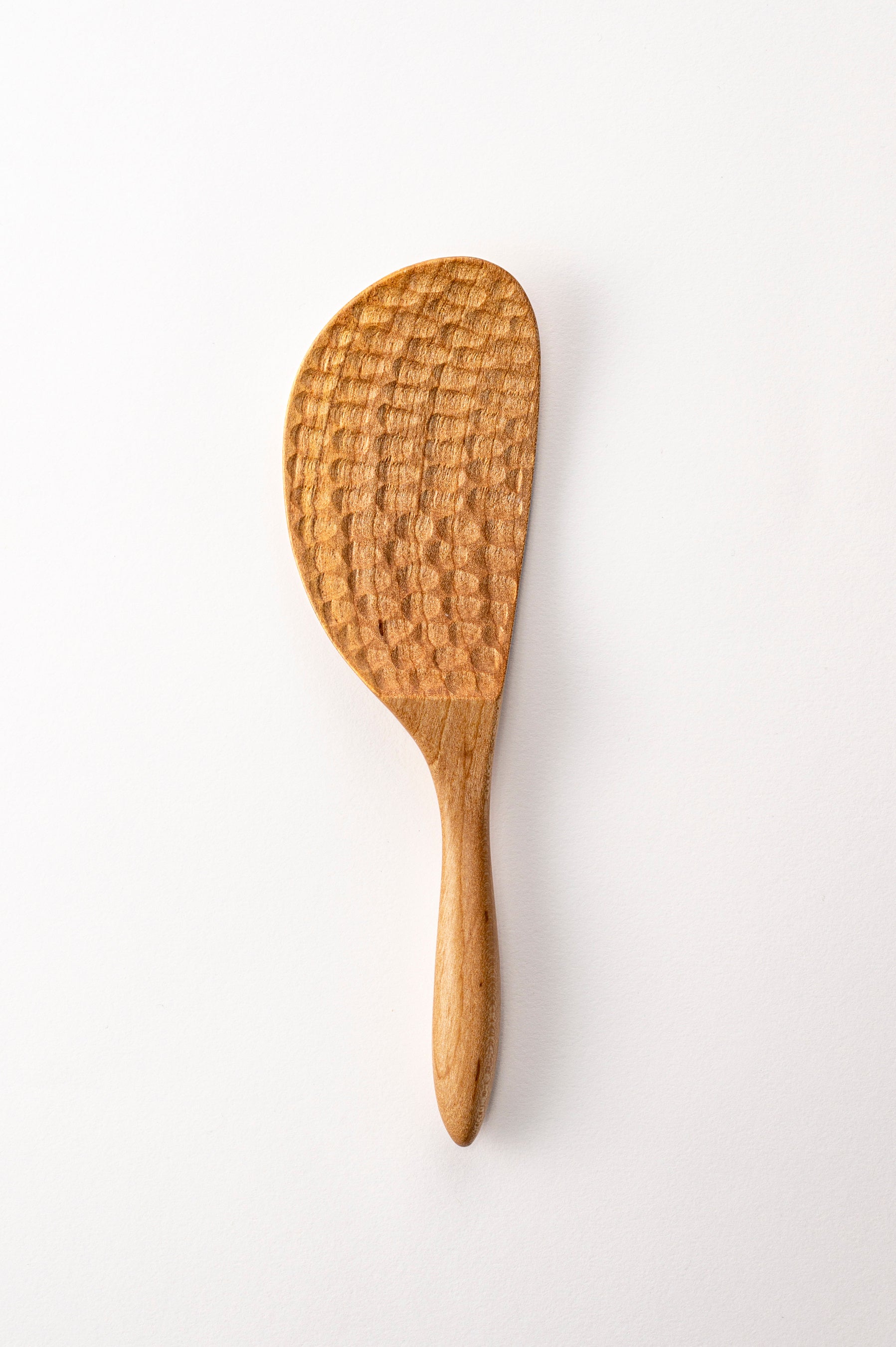 今回発売する「杓文字(しゃもじ)」は、福岡県糸島市の「工房 雲」の木工職人 小野寺 幸裕さんの手によるもの。さっと持ち上げやすく、握りやすい形状が特徴です。ご飯粒がつきにくいよう、すくう面には彫り目をほどこしました。ぜひ日々の食卓に取り入れていただければ幸いです。