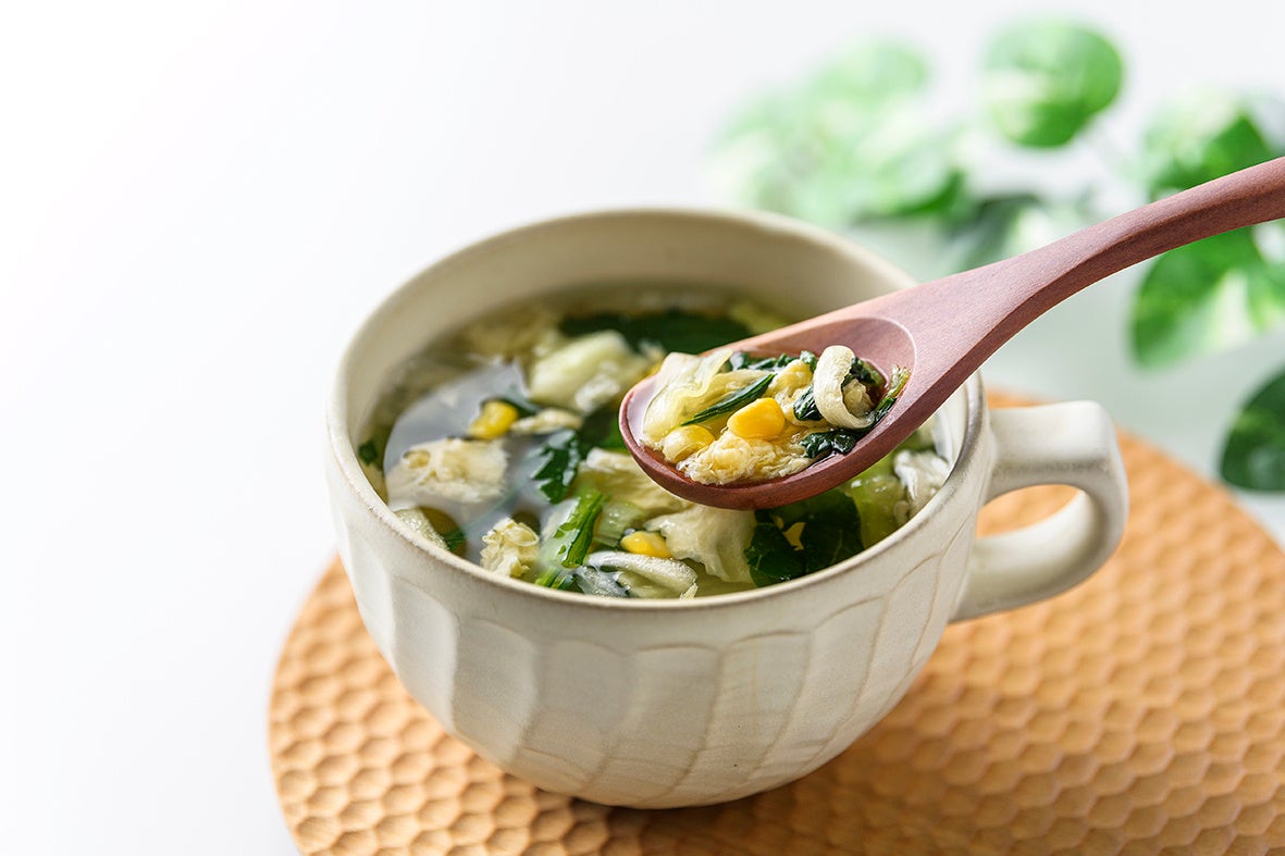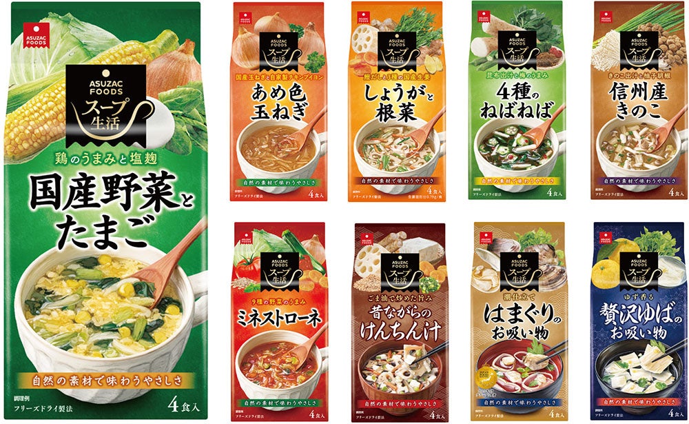 【商品名】国産野菜とたまごのスープ、あめ色玉ねぎのスープ、しょうがと根菜のスープ、4種のねばねばスープ、信州産きのこのスープ、ミネストローネ、昔ながらのけんちん汁、はまぐりのお吸い物、贅沢ゆばのお吸い物