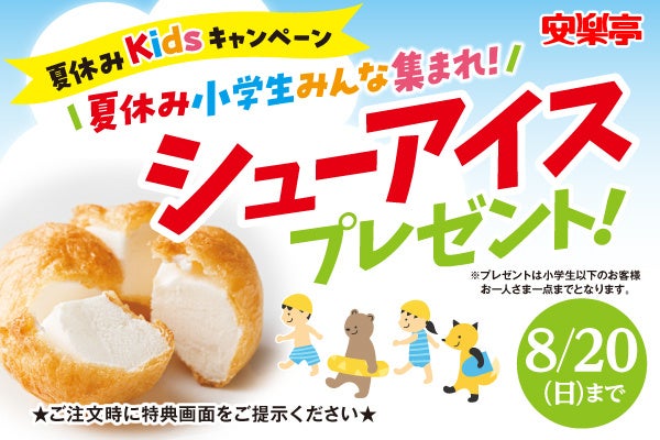 夏休みのご家族連れを応援するキッズキャンペーンとして、ご来店の小学生以下のお子さま1名様につき1点「シューアイス」をプレゼントいたします! 家族一緒に、安楽亭で思う存分焼肉を楽しんでください!