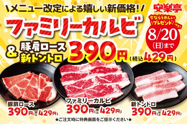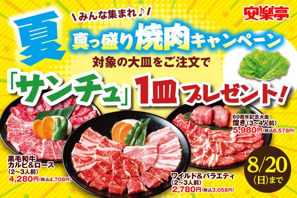 焼肉レストラン安楽亭(本社:埼玉県さいたま市、代表取締役社長:柳 先)は、創業60周年を記念して「サンキュープライス」390円(税込429円)に価格改定した「ファミリーカルビ」はじめ人気3メニューのご注文で「チーズフォンデュソース」などのトッピング特典や、対象の大皿をご注文で「サンチュ」1皿プレゼント、お子さま向けに「シューアイス」のプレゼントなど、夏休みに美味しく嬉しい「みんな集まれ!夏真っ盛り焼肉キャンペーン!」を8月10日(木)から8月20日(日)までの期間限定で実施いたします。
