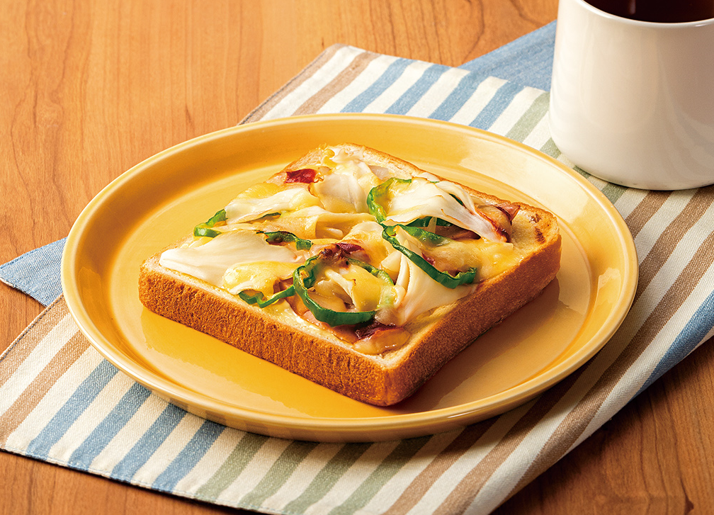 白まいたけを使った彩りも綺麗なピザトーストです。