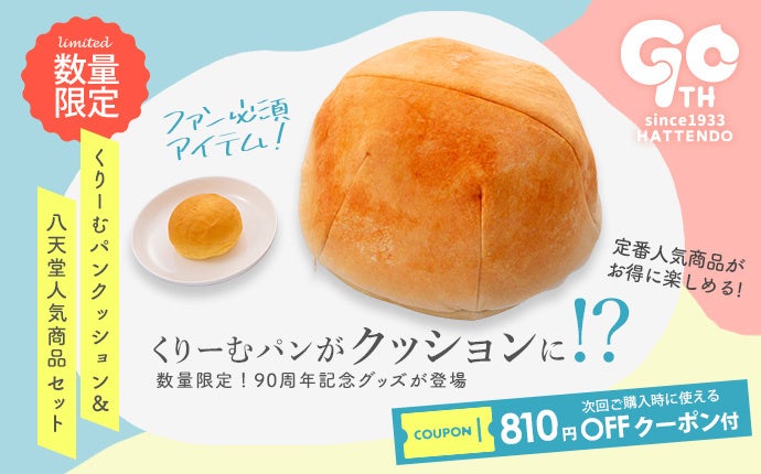 「くりーむパンクッション」は、代表商品「冷やして食べるくりーむパン」の世界観をクッションで表現した創業90周年記念のオリジナルグッズで、本日8月10日の八天堂の日からお披露目となりました。