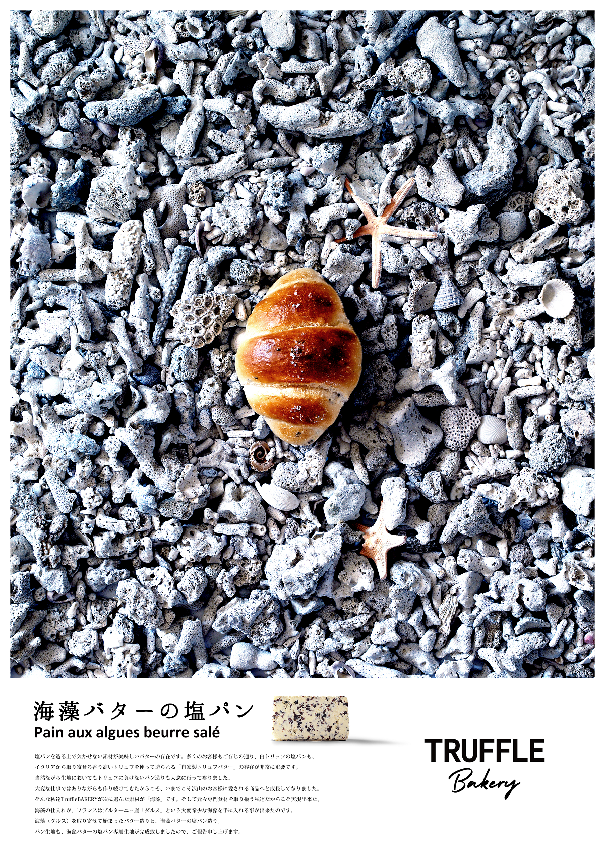塩パンを作る上で欠かせない素材が美味しいバターの存在です。TruffleBAKERYで人気の白トリュフの塩パンもイタリアから取り寄せる香り高いトリュフを使って作る美味しい「自家製トリュフバター」が完成したことが始まりでした。TruffleBAKERYが次に選んだ素材は海藻(ダルス)です。ブルターニュ地方で年に2回しか収穫できない貴重な海藻(ダルス)をお客様にどうしても味わってほしく、直接輸入し、バターづくりを始めました。もちろん海藻バターにあうパン生地づくりも試行錯誤を繰り返し入念に行ってきました。1年という年月をかけ、納得のいくバターが出来たことで、皆様にお届けする塩パンが完成しました。ここでしか味わえない海藻バターの塩パンは我々TruffleBAKERYの次の推しパンとなります。