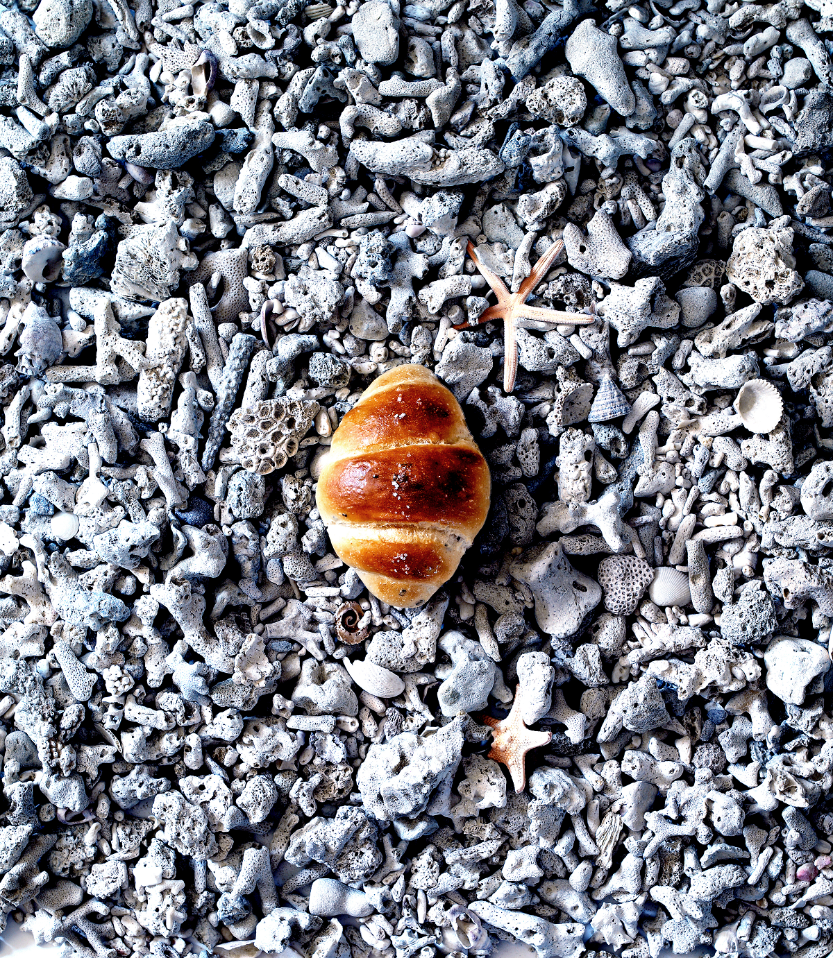 そしてこのバターを引き立てるためにもう一つ必要な仕事が生地作りです。この海藻バターの良さと、パンとしてのおいしさを追求するために、バターと同じ口溶けを再現する必要性と、海藻の香りと調和を生み出せる生地が必要でした。生地は白トリュフの塩パンとは全く異なる考えで作っています。白トリュフの塩パンは弾力と引きの強さを特徴としているのに対し、海藻バターの塩パンは、口溶けと軽さを重視したパンとなっています。パンには湯種を採用し、国産の米粉と軽さを出すために北海道産のライ粉を使用、更にライ麦を入れる事により生地に膜を張る効果を活かし、海藻(ダルス)の香りをより楽しめるように設計しました。数多くのサンプル作りを行い、この海藻バターの良さを最も提供出来るカタチとしてここに完成しました。サクサク、もちもちした生地と溶け出すバター、そして海藻(ダルス)の香りをお楽しみいただける逸品です。