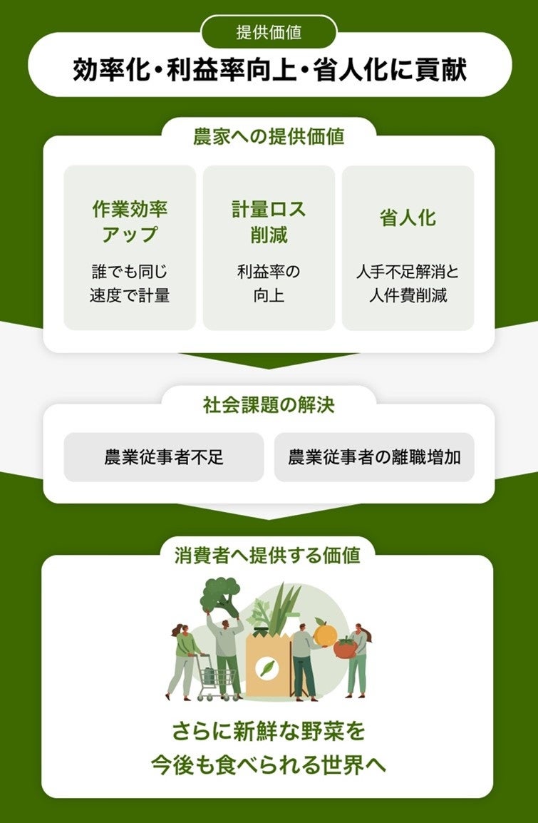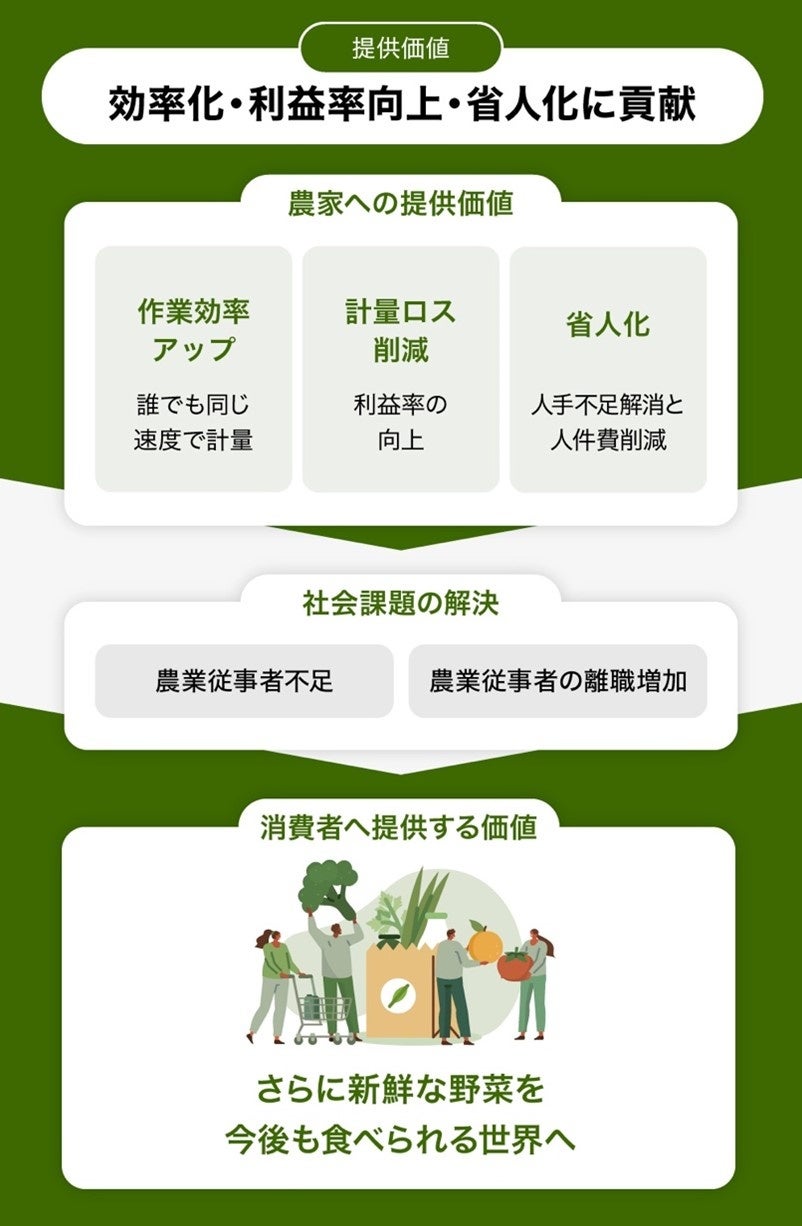 弊社は、小〜中規模の農家でも導入しやすい価格帯の計量機を提供することで、出荷作業の効率化をはかり、農業と家族の生活を両立できる働き方の実現を目指しています。一時的な負担の大きさが原因で辞めてしまうケースを減らし、利益率をあげることで、農業就業者の増え続ける離農に歯止めをかけ、いつまでも鮮度が高く美味しい野菜が食べられる世界をつくりたいと考えています。