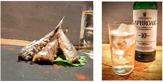 (ペアリングのポイント:メヒカリフリットに使用したスモークパプリカの香りとスモーキーなアイラモルトウイスキーのペアリングです)