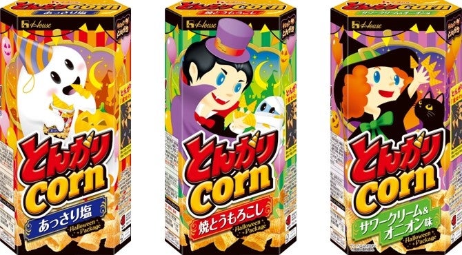 左から、「サワークリーム&オニオン味」、「あっさり塩」「焼とうもろこし」「サワークリーム&オニオン味」ハロウィンパッケージ