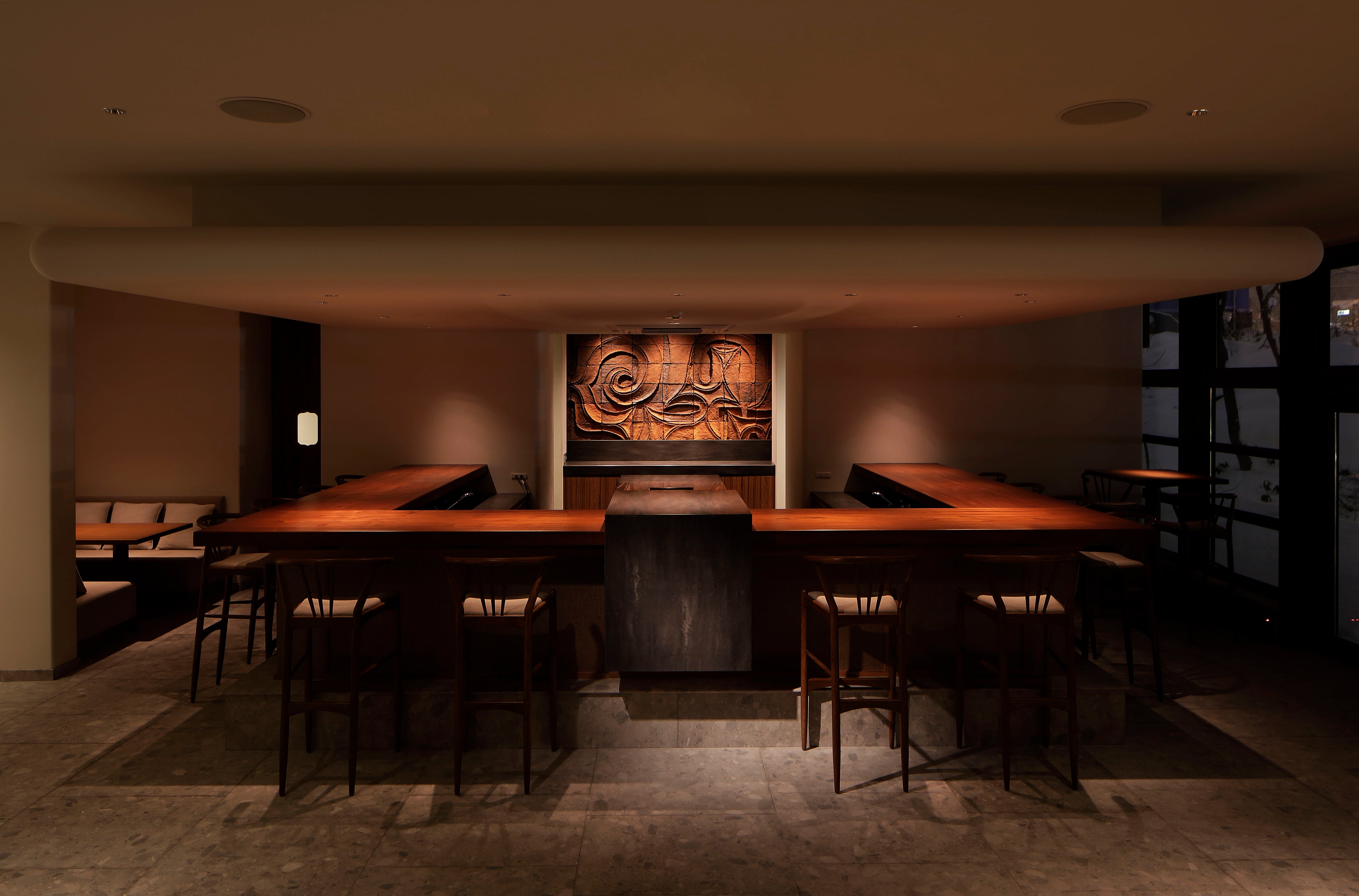 ダイニングではアラカルト、コース、シェフズテーブルが選択可能です。シェアスタイルのお料理から、コーススタイルのお料理まで、さまざまなダイニングシーンに合わせた新解釈による炉端焼プレゼンテーションをお愉しみいただけます。ダイニングの中央には北海道を中心とした旬の食材をディスプレイ。シェフズテーブルではお客様がディスプレイから食材を選び、シェフが目の前のオープンキッチンで北海道が誇る旬の食材をグリルで豪快に焼き上げ、特別な一皿に仕上げます。