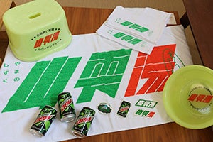 今回の「山雫湯」の限定オープンを記念した、オリジナルデザインのバスタオルやフェイスタオル、風呂桶、風呂椅子など全4種類の体験用アイテム(非売品)をご用意しています。さらに、入場いただいた方限定で「山雫湯」案内人の「ハンギョドン」とのコラボデザインを含む4種類のステッカー(4種中1種を配布いたします)や、「マウンテンデュー」(1回のご利用につきお1人1本まで)も無料配布予定です。(なくなり次第配布終了となります)。