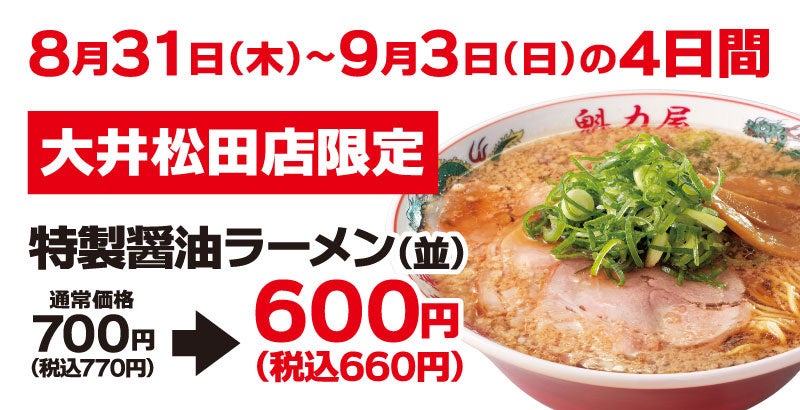 この度オープンを記念して、「大井松田店」にご来店いただいたお客様には、『特製醤油ラーメン(並)』を600円(税込660円)で販売いたします。
