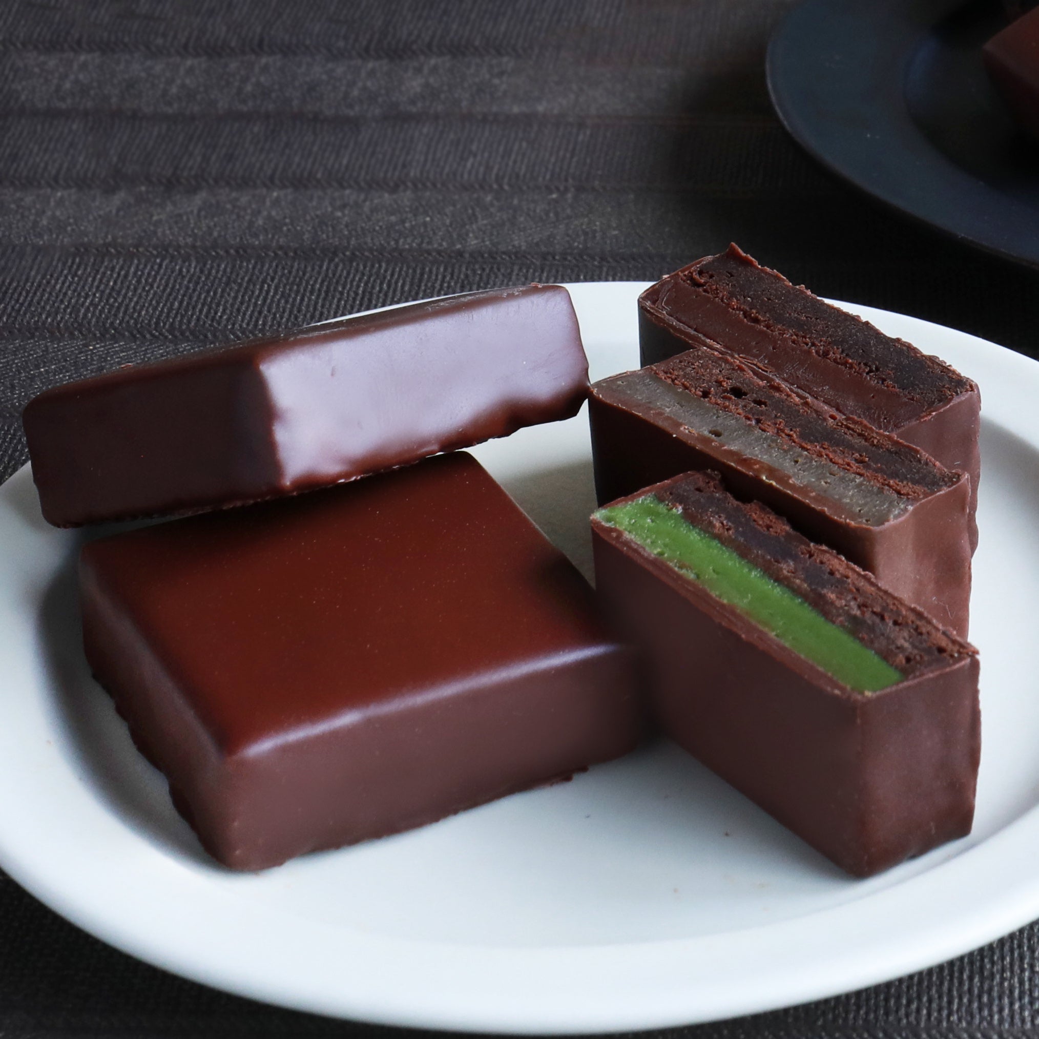 しっとりとしたチョコレート生地に濃厚ガナッシュをのせ、パリッとチョコレートでコーティングした3層のプチショコラケーキ「パリトロ」の定番「スイート」と期間限定「深み抹茶」「ほうじ茶」の詰め合わせが今年も登場。豊かな香りのお茶の味わいをチョコレートで包みました。温かい緑茶と合わせることで優しくチョコレートの甘みが口の中に広がります。 |