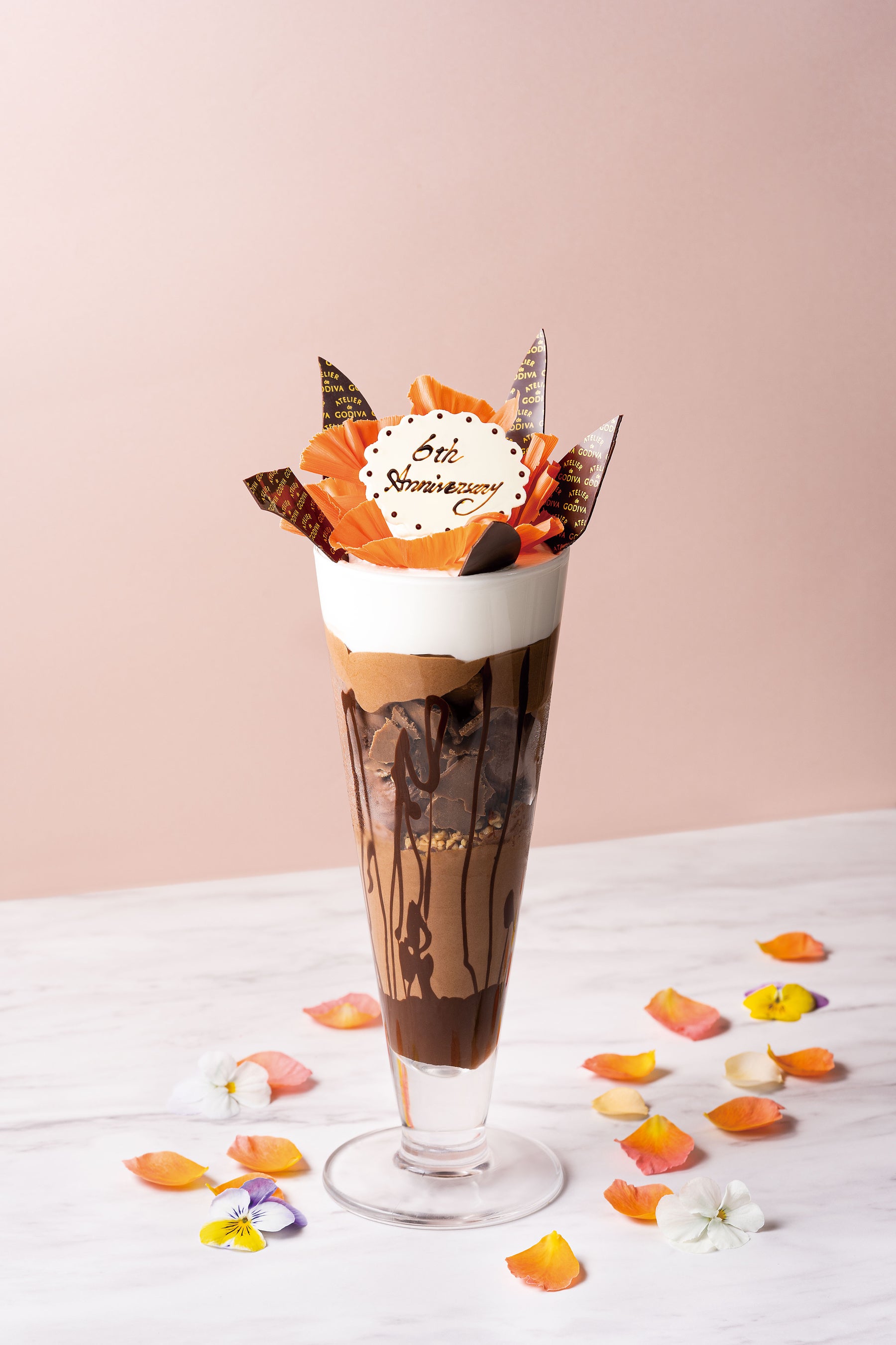 6周年を迎える「ATELIER de GODIVA 西武池袋本店」から日ごろの感謝の気持ちと共にお贈りする、オリジナリティにあふれる華やかなデコレーションのショコラ パルフェをご堪能ください。