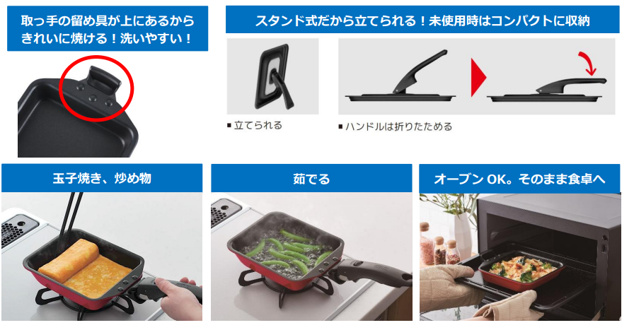 IH・ガス火対応で、カラーは、レッドとブラックの2色を展開。あわせてサーモスの「玉子焼きフライパン」各種に使える『サーモス 折りたたみスタンド式玉子焼きフライパンフタ(KLI-001)』も新発売します。