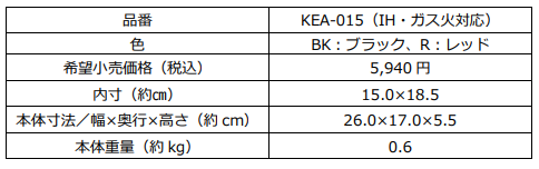 『サーモス デュラブルシリーズ 取っ手のとれる玉子焼きフライパンKEA(KEA-015)』 仕様一覧