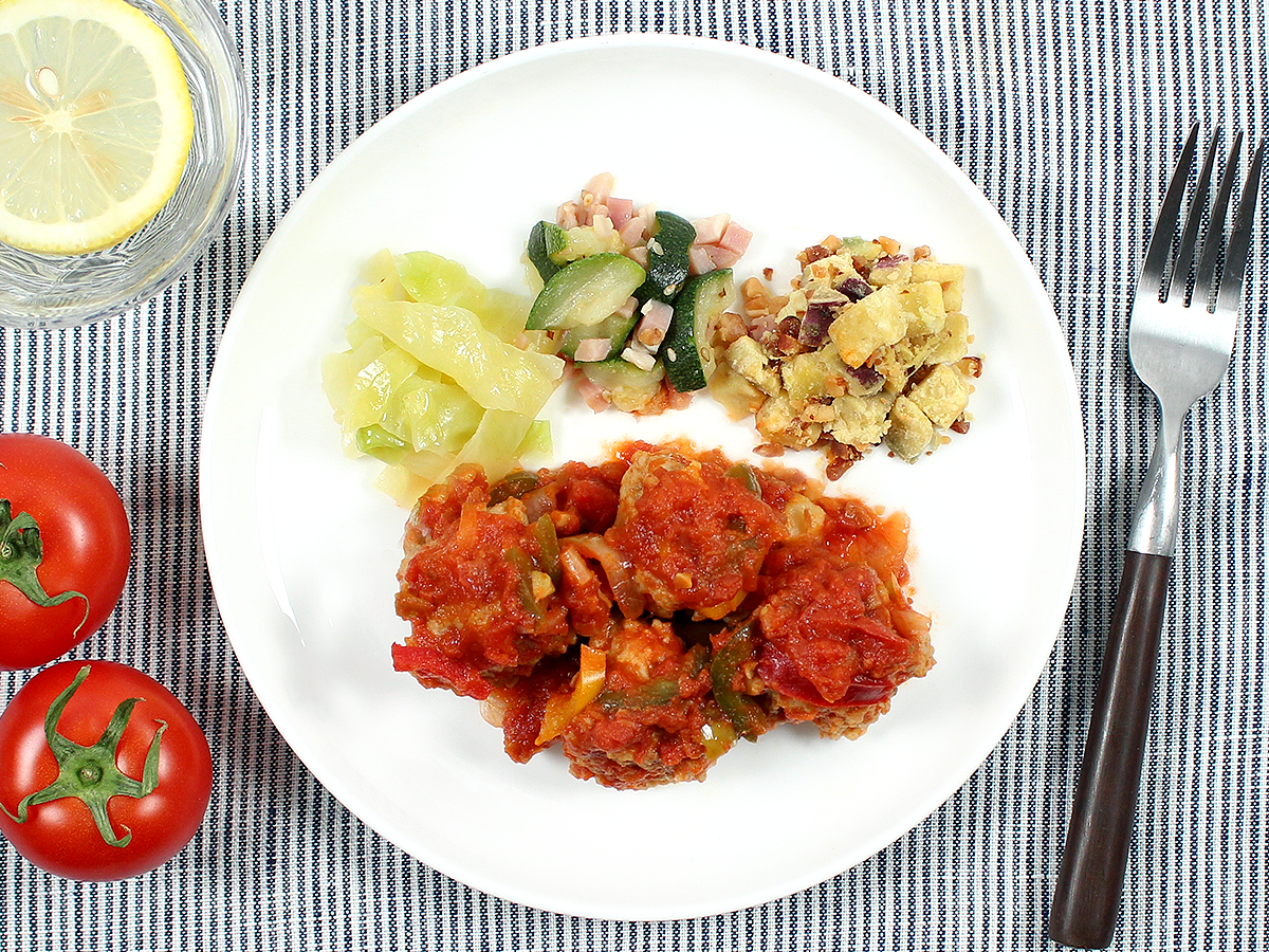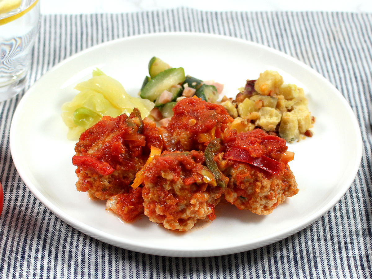 国産の真鯵で団子を作り、オリーブの香るトマトソースで仕上げました。爽やかなトマトの酸味が暑い夏にピッタリのプレートです。玉ねぎとパプリカが添えてあり、ラタトゥイユ風のプレートです。