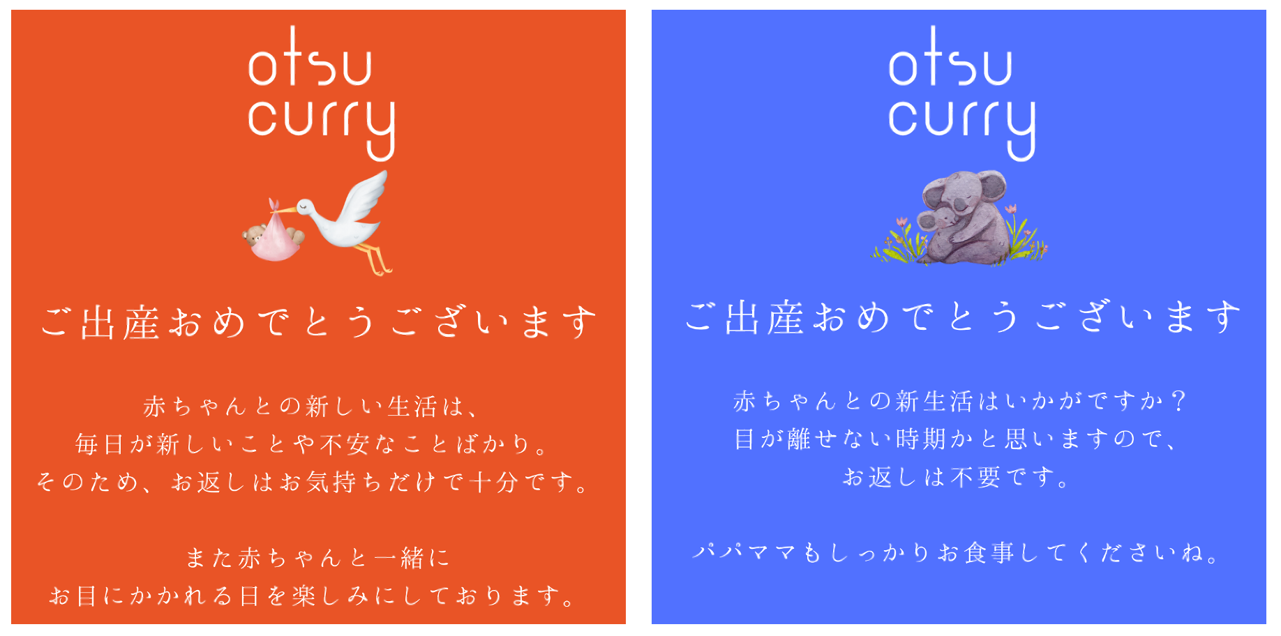 産後、満身創痍で多忙な中、出産のお祝い返しの手配は大変。多くのママ達は、お祝い返しをもらいたいためにお祝いを送っていないと証言。ostucurryでは、ご希望の方に向けお返し不要カードを準備。お祝いを贈る方も贈られる方も気を使わないギフト交流のきっかけに。(画像は一例)