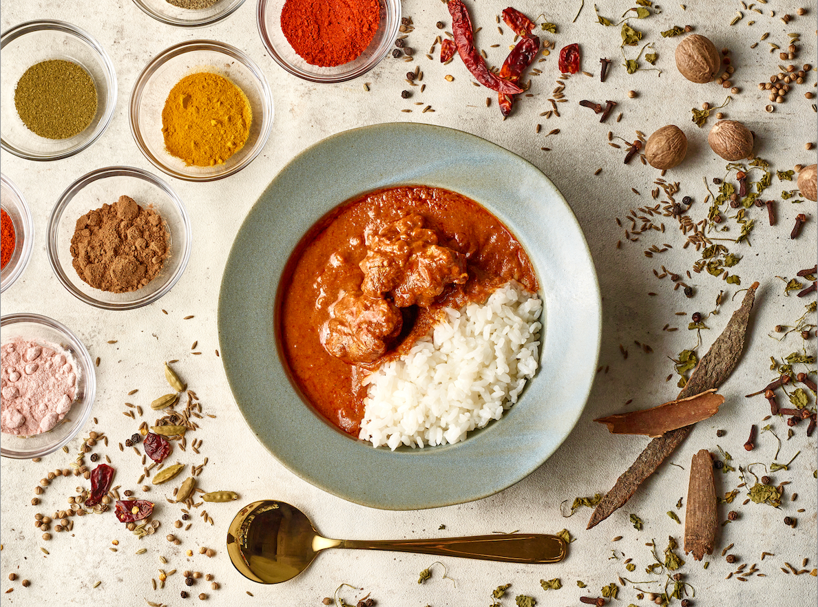 【バターチキンカレー】和歌山県産紀の国みかんどりを使用。身体全体に送り込まれるスパイシーさとトマトの酸味に乳製品が絶妙に混じり合った唯一無二の味。陳皮入り飼料でじっくり育てた「紀の国みかんどり」はホロホロ食感。
