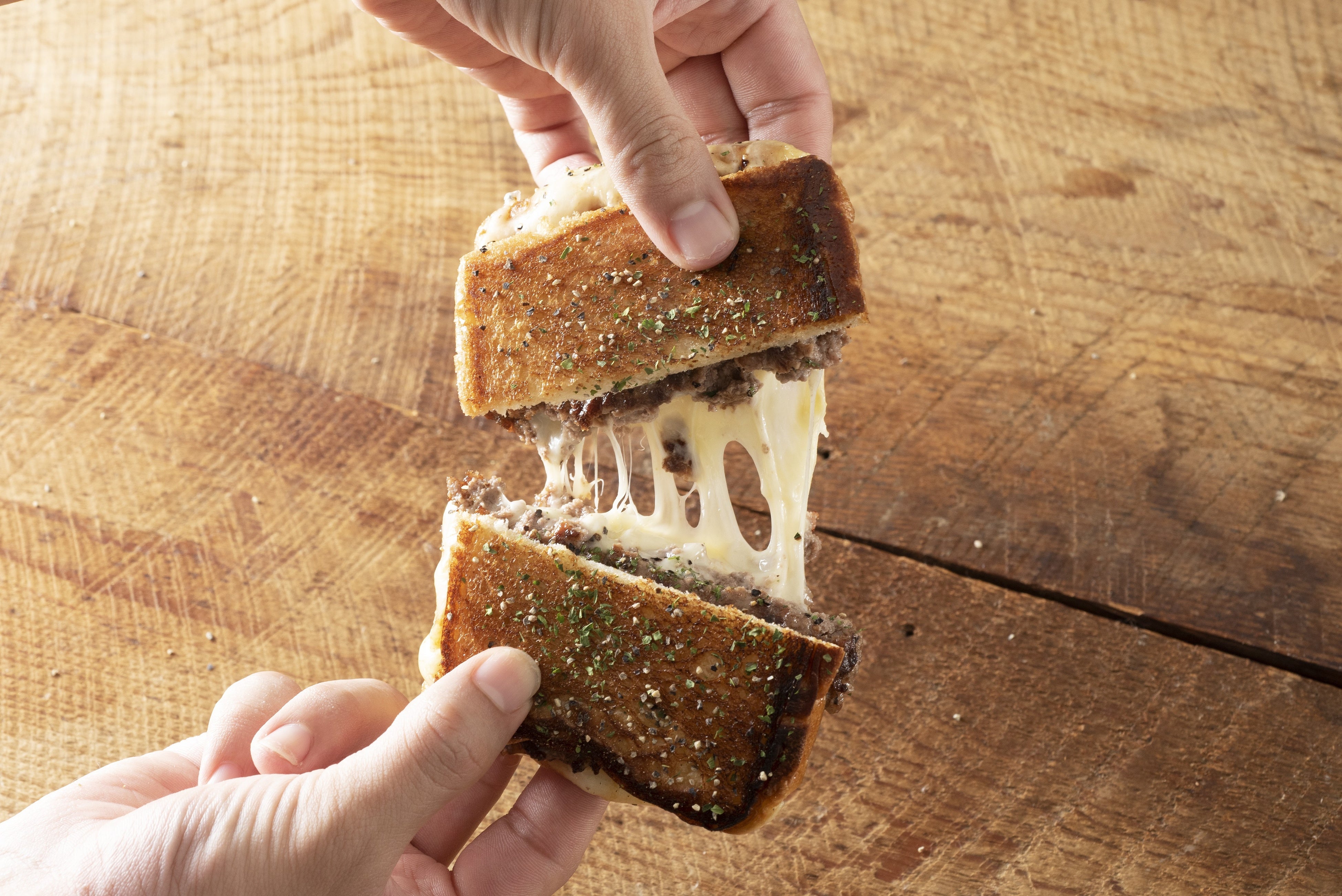 「JB’sTOKYOミヤシタパーク店」限定のハンバーガーとして、「クリスピー★チーズバーガー」を発売します。 元々は新大久保や原宿で売られている「10円パン」の楽しさにハマった創業者ブルース佐藤(56歳)が、“10円パンの最上位互換”を目指して開発したレシピですが、結果として“チーズが伸びる”点以外は10円パンと全く異なる、新しい食感の美味しいハンバーガーが完成しました。 パティだけでなく、バンズの食パンも鉄板上でスマッシュ(潰し焼き)してカリカリのクリスピー食感に仕上げているのが特徴。 溶けて伸びるチーズに合う自家製テリヤキソースが味の決め手です。 ぜひ熱々チーズを長く伸ばしながら、楽しくお召し上がりください。