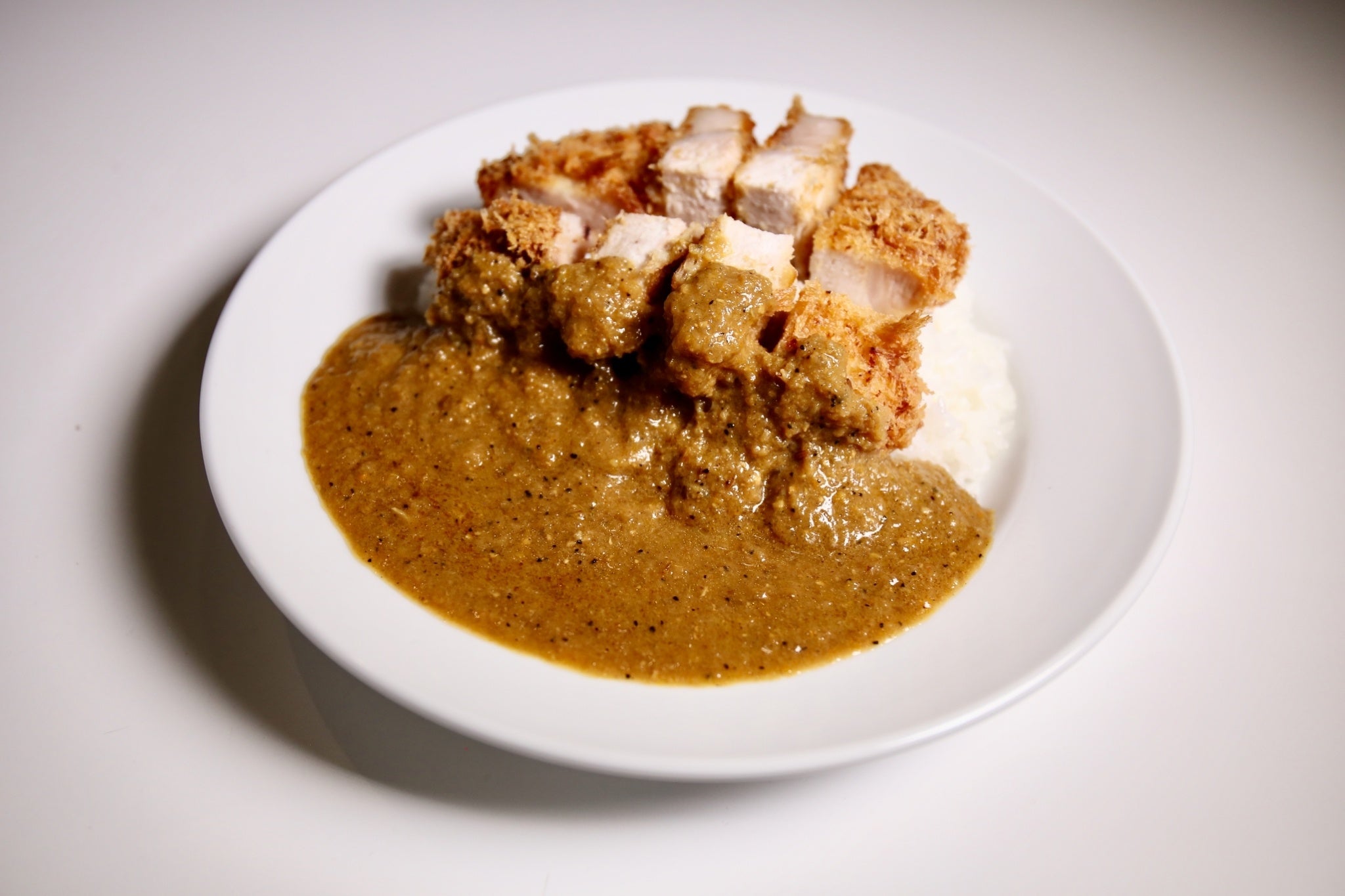 ルーは「トンカツ屋の作る最強のカツカレー」をコンセプトにりんご、玉ねぎ、人参、豚肉等をあらかじめヨーグルトと米の磨ぎ汁乳酸菌で発酵熟成させ、そこに長時間煮込んで作る自家製フォン・ドゥ・ポーを合わせてさらに煮込み、素材の旨みを凝縮させ引き出すことで、深いコクと味わいのあるルーに仕上げています。スパイスカレーと欧風カレーのいいとこ取りをしたストライクゾーンの広い王道の味をめざしており、見た目はコーヒーとグリーンカレーベースでスパイシーさを表現し、フォン・ドゥ・ポーベースのルーカレーで欧風のカレーをイメージしました。純粋にカツカレーを味わっていただくため、トッピングは副菜を用意せずトンカツ屋の作る最強のトンカツだけをのせています。