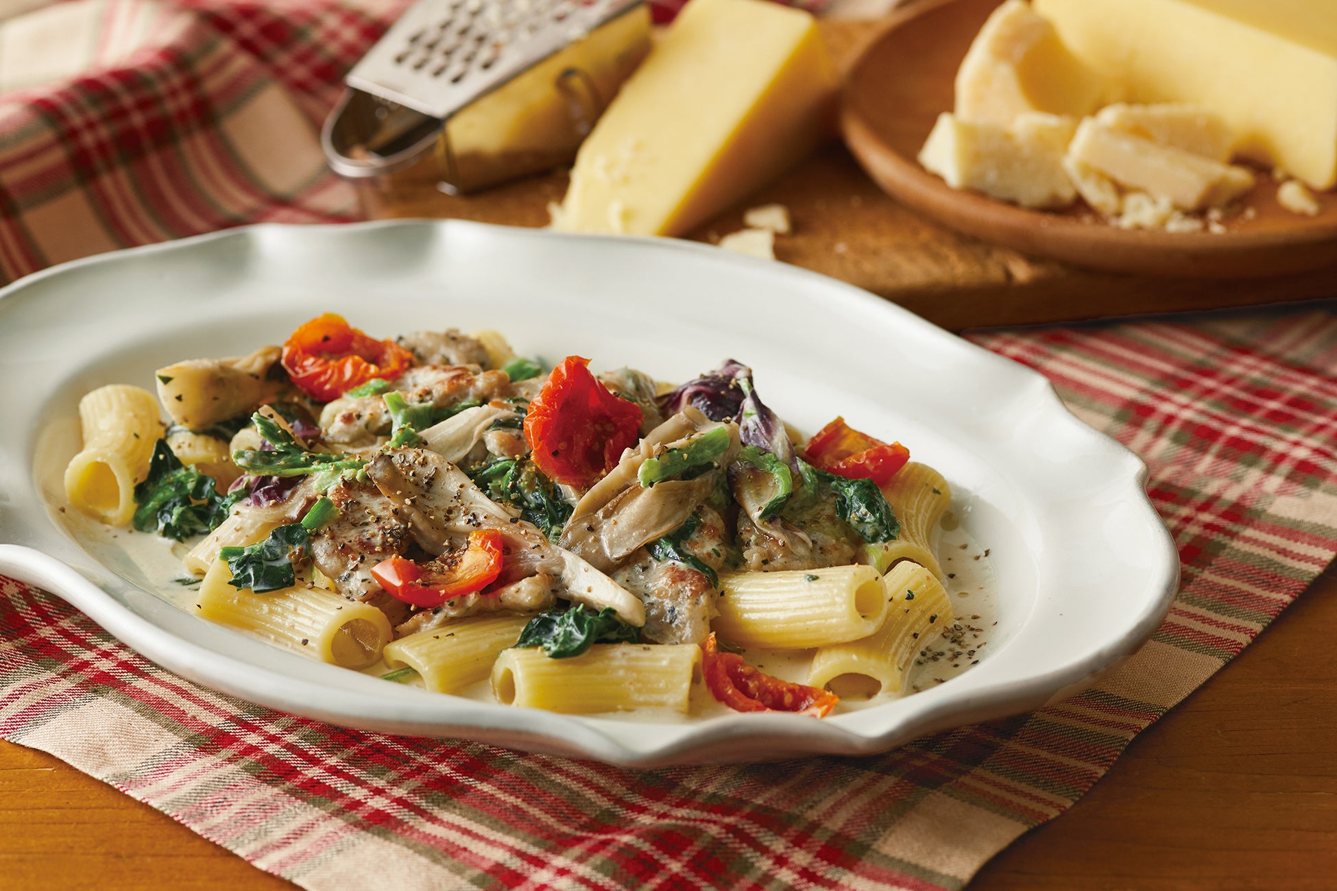 もちもち食感のリガトーニ、サルシッチャ、舞茸にパルメザンチーズやブルーチーズなどの4種のチーズとくるみペーストを加えたソースを合わせました。