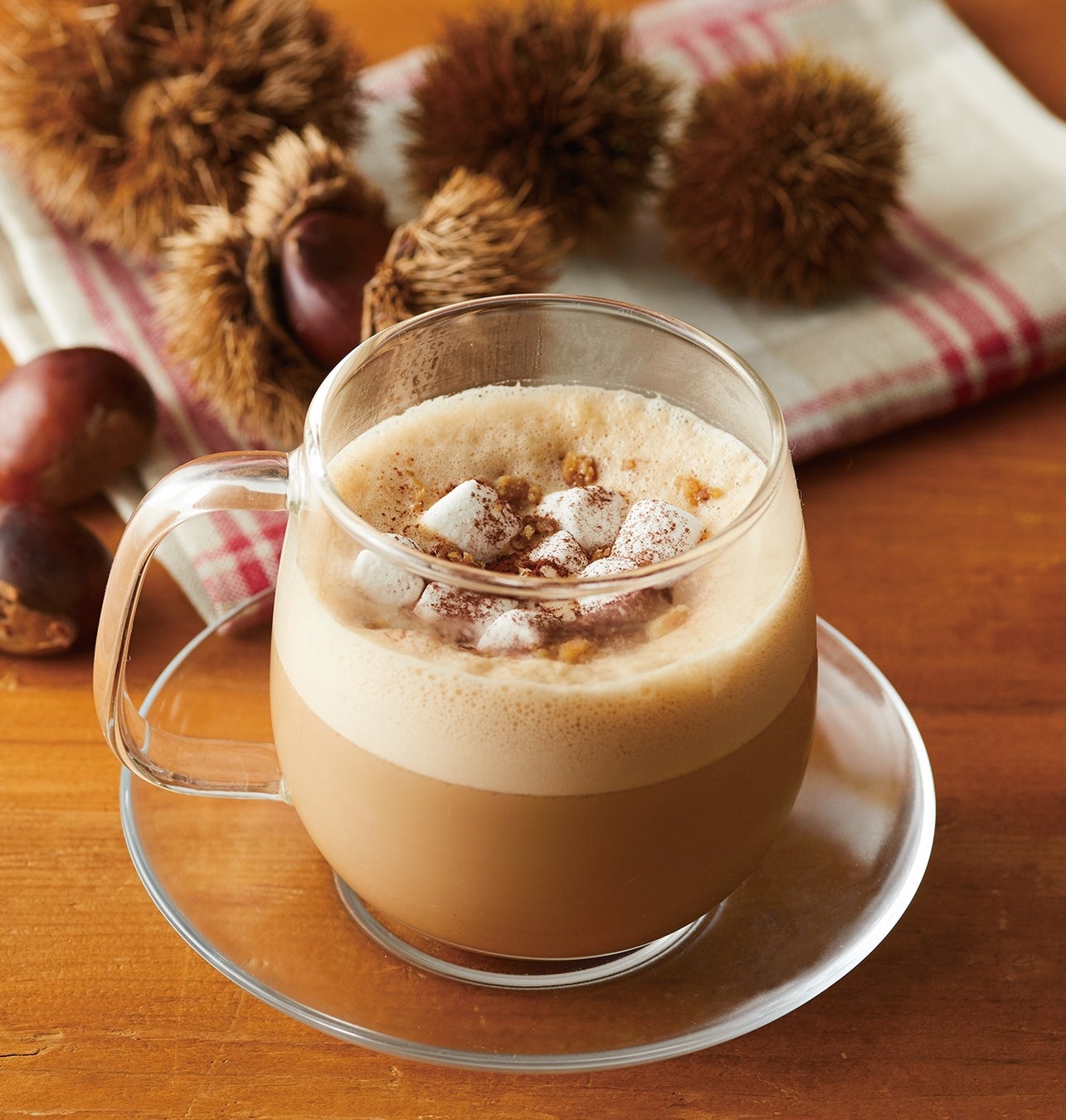 イタリア産栗のマロンペーストのコクが広がるチャイに、マシュマロ、栗、ココアをトッピング。