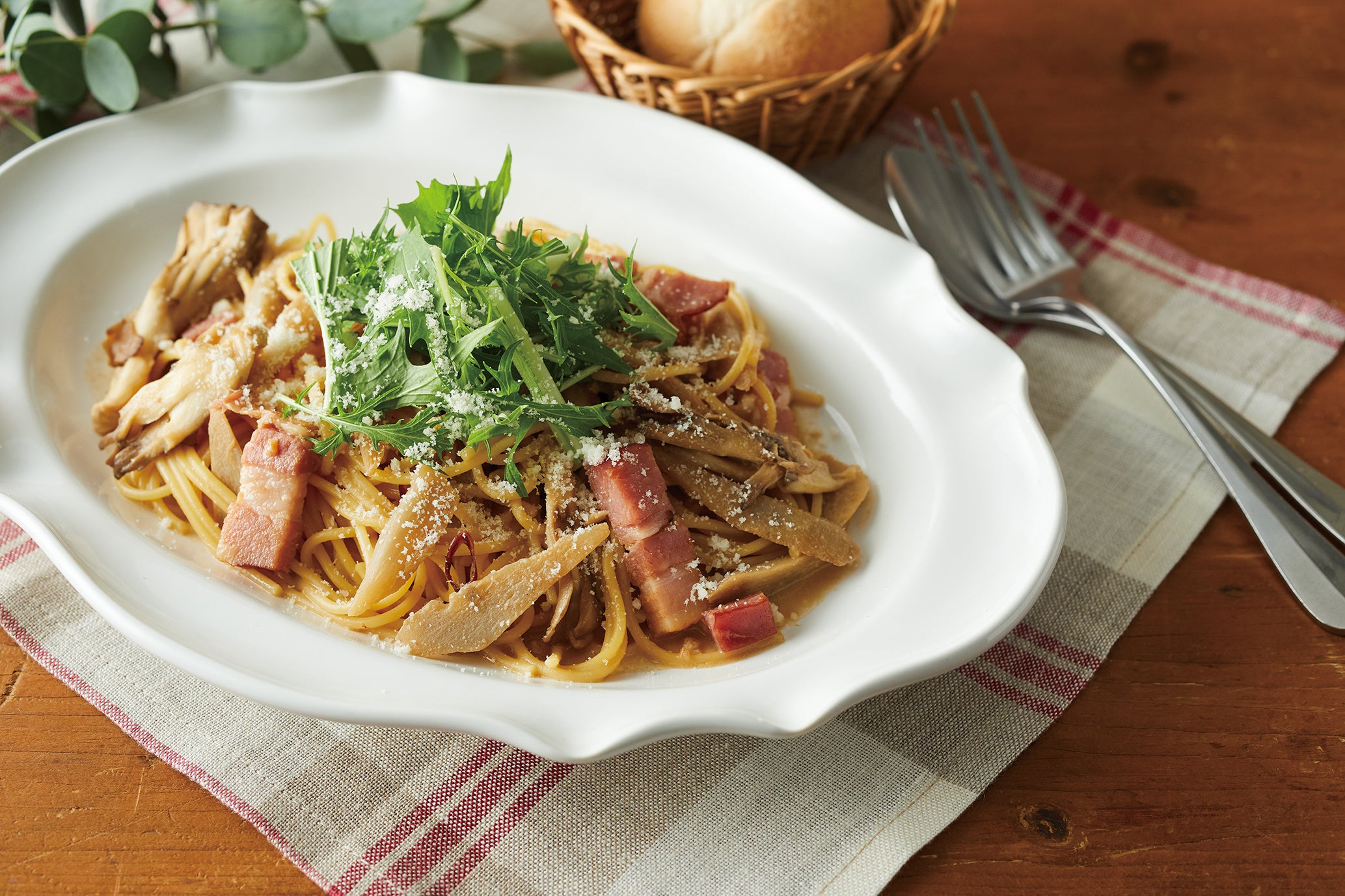 厚切りベーコン、舞茸、ごぼうをじっくりと炒め、香ばしい醤油ソース、ねりごまと合わせました。水菜の食感がアクセント。