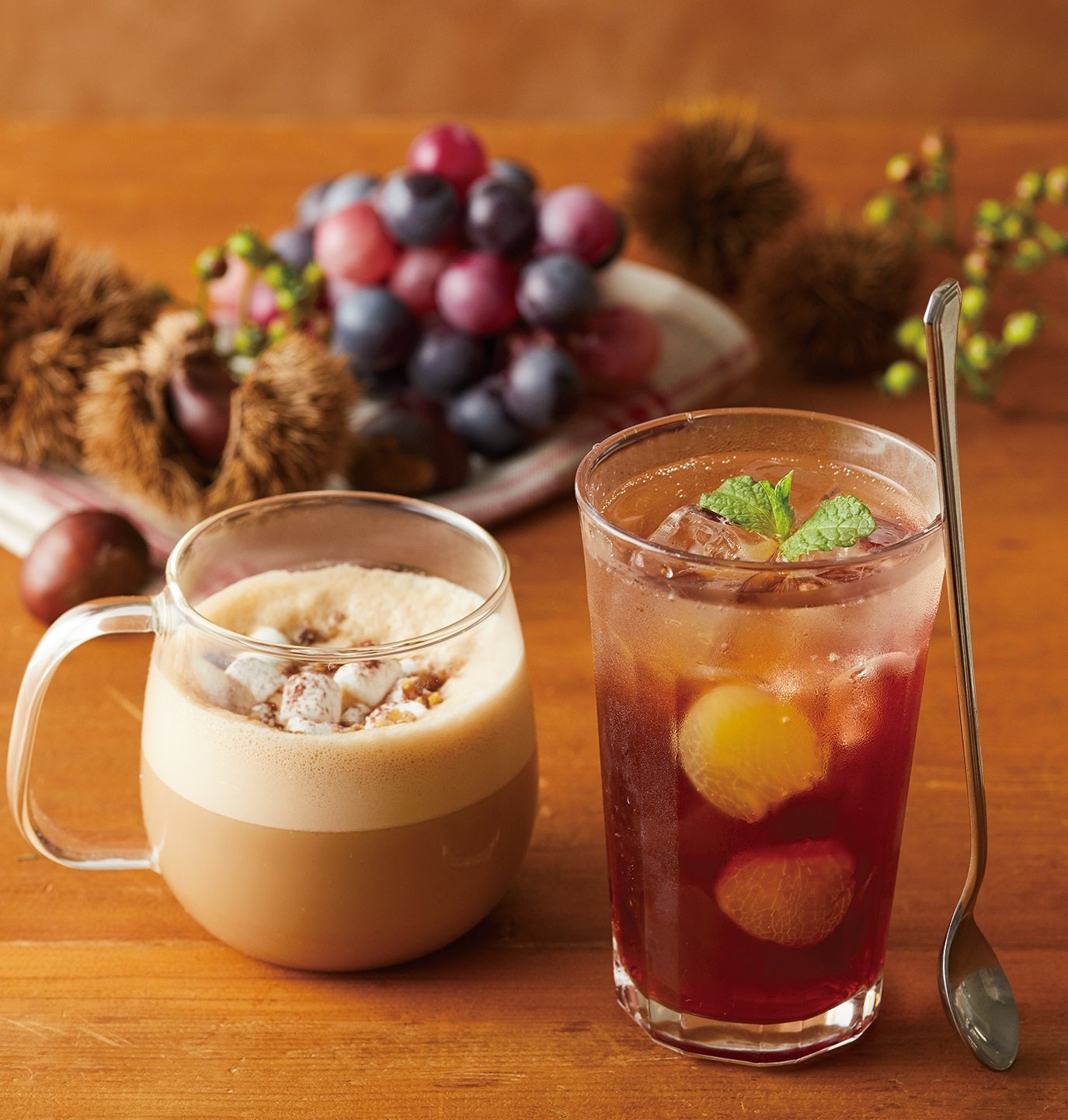 そのほか、巨峰の果肉入り「巨峰ルイボスのスパークリングジュレッティー」や、イタリア産栗のマロンペーストのコクが広がる「マロンチャイ」、くるみペーストなどソースに使用したパスタ「サルシッチャと舞茸のリガトーニ 4種チーズソース」など、様々な秋グルメを展開します。